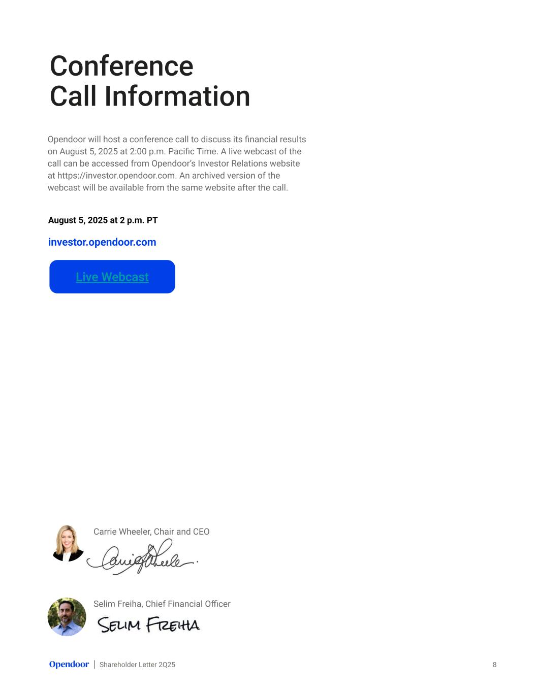 Shareholder Letter 2Q25 Carrie Wheeler, Chair and CEO Selim Freiha, Chief Financial Officer Opendoor will host a conference call to discuss its financial results on August 5, 2025 at 2:00 p.m. Pacific Time. A live webcast of the call can be accessed from Opendoor’s Investor Relations website at https://investor.opendoor.com. An archived version of the webcast will be available from the same website after the call. August 5, 2025 at 2 p.m. PT investor.opendoor.com Conference Call Information 8 Live Webcast