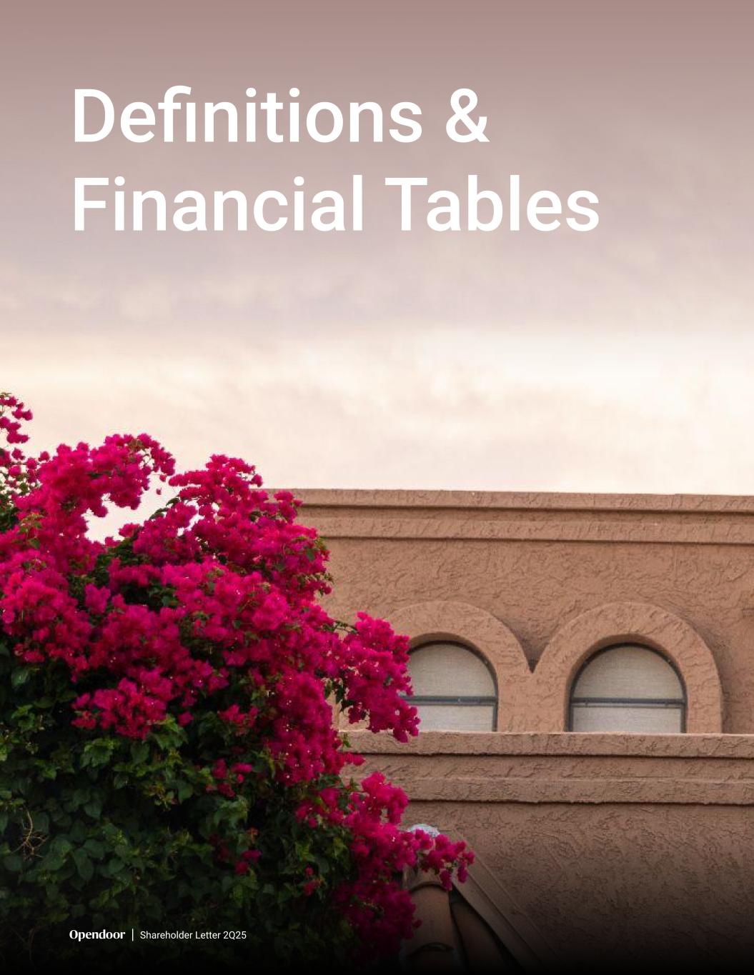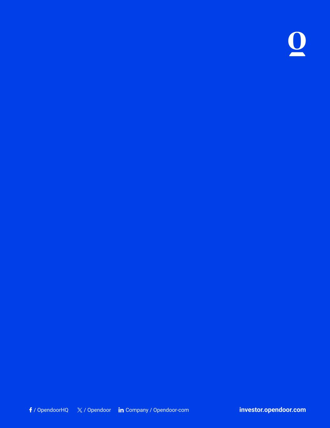 Use of Non-GAAP Financial Measures To provide investors with additional information regarding the Company’s financial results, this shareholder letter includes references to certain non-GAAP financial measures that are used by management. The Company believes these non-GAAP financial measures including Adjusted Gross Profit, Contribution Profit, Adjusted Net Loss, Adjusted EBITDA, Adjusted Operating Expenses, and any such non-GAAP financial measures expressed as a Margin, are useful to investors as supplemental operational measurements to evaluate the Company’s financial performance. The non-GAAP financial measures should not be considered in isolation or as a substitute for the Company’s reported GAAP results because they may include or exclude certain items as compared to similar GAAP-based measures, and such measures may not be comparable to similarly-titled measures reported by other companies. Management uses these non- GAAP financial measures for financial and operational decision-making and as a means to evaluate period-to-period comparisons. Management believes that these non-GAAP financial measures provide meaningful supplemental information regarding the Company’s performance by excluding certain items that may not be indicative of the Company’s recurring operating results. Adjusted Gross Profit and Contribution Profit To provide investors with additional information regarding our margins and return on inventory acquired, we have included Adjusted Gross Profit and Contribution Profit, which are non-GAAP financial measures. We believe that Adjusted Gross Profit and Contribution Profit are useful financial measures for investors as they are supplemental measures used by management in evaluating unit level economics and our operating performance. Each of these measures is intended to present the economics related to homes sold during a given period. We do so by including revenue generated from homes sold (and adjacent services) in the period and only the expenses that are directly attributable to such home sales, even if such expenses were recognized in prior periods, and excluding expenses related to homes that remain in inventory as of the end of the period. Contribution Profit provides investors a measure to assess Opendoor’s ability to generate returns on homes sold during a reporting period after considering home purchase costs, renovation and repair costs, holding costs and selling costs. Adjusted Gross Profit and Contribution Profit are supplemental measures of our operating performance and have limitations as analytical tools. For example, these measures include costs that were recorded in prior periods under GAAP and exclude, in connection with homes held in inventory at the end of the period, costs required to be recorded under GAAP in the same period. Accordingly, these measures should not be considered in isolation or as a substitute for analysis of our results as reported under GAAP. We include a reconciliation of these measures to the most directly comparable GAAP financial measure, which is gross profit. 12 Definitions