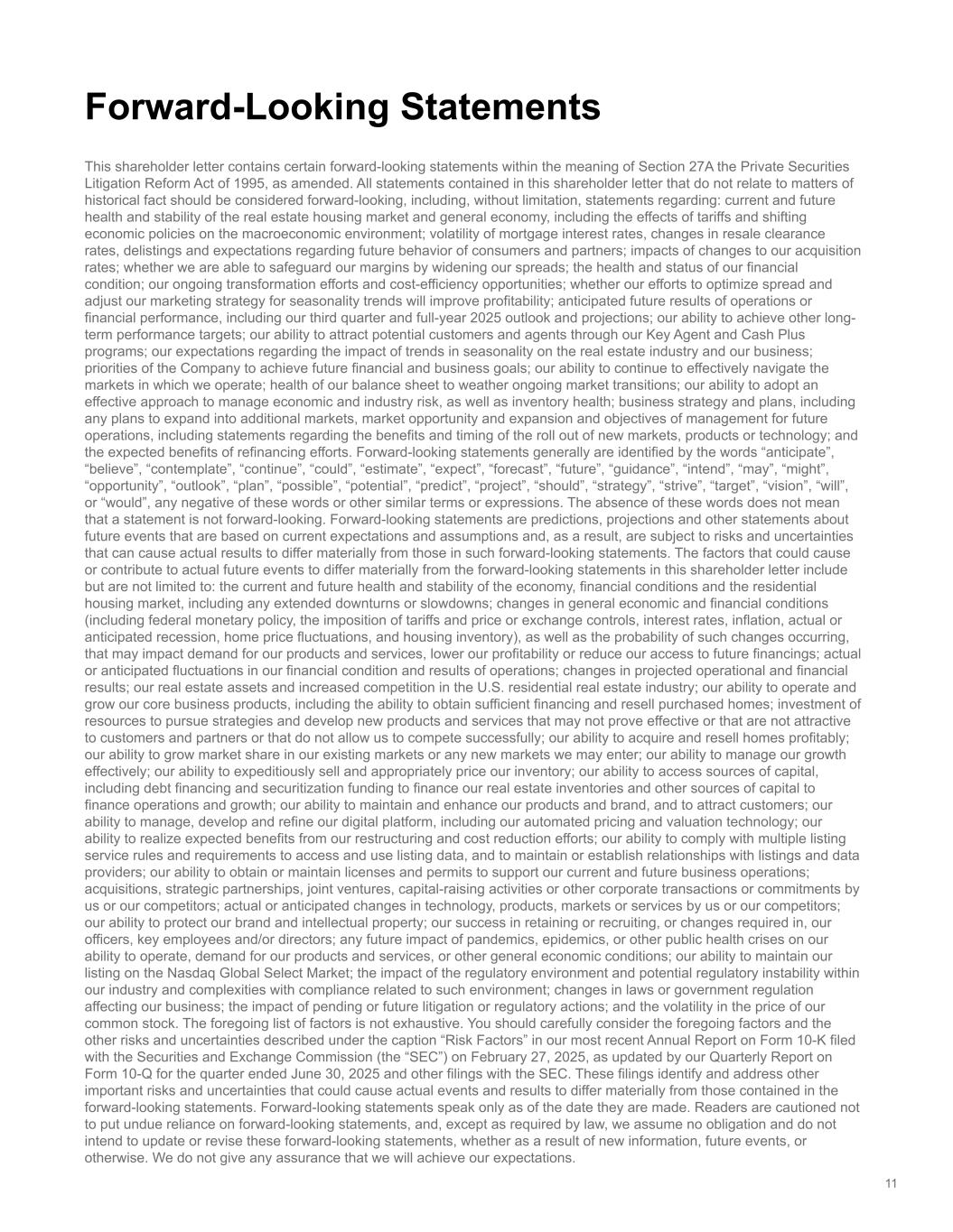 This shareholder letter contains certain forward-looking statements within the meaning of Section 27A the Private Securities Litigation Reform Act of 1995, as amended. All statements contained in this shareholder letter that do not relate to matters of historical fact should be considered forward-looking, including, without limitation, statements regarding: current and future health and stability of the real estate housing market and general economy, including the effects of tariffs and shifting economic policies on the macroeconomic environment; volatility of mortgage interest rates, changes in resale clearance rates, delistings and expectations regarding future behavior of consumers and partners; impacts of changes to our acquisition rates; whether we are able to safeguard our margins by widening our spreads; the health and status of our financial condition; our ongoing transformation efforts and cost-efficiency opportunities; whether our efforts to optimize spread and adjust our marketing strategy for seasonality trends will improve profitability; anticipated future results of operations or financial performance, including our third quarter and full-year 2025 outlook and projections; our ability to achieve other long- term performance targets; our ability to attract potential customers and agents through our Key Agent and Cash Plus programs; our expectations regarding the impact of trends in seasonality on the real estate industry and our business; priorities of the Company to achieve future financial and business goals; our ability to continue to effectively navigate the markets in which we operate; health of our balance sheet to weather ongoing market transitions; our ability to adopt an effective approach to manage economic and industry risk, as well as inventory health; business strategy and plans, including any plans to expand into additional markets, market opportunity and expansion and objectives of management for future operations, including statements regarding the benefits and timing of the roll out of new markets, products or technology; and the expected benefits of refinancing efforts. Forward-looking statements generally are identified by the words “anticipate”, “believe”, “contemplate”, “continue”, “could”, “estimate”, “expect”, “forecast”, “future”, “guidance”, “intend”, “may”, “might”, “opportunity”, “outlook”, “plan”, “possible”, “potential”, “predict”, “project”, “should”, “strategy”, “strive”, “target”, “vision”, “will”, or “would”, any negative of these words or other similar terms or expressions. The absence of these words does not mean that a statement is not forward-looking. Forward-looking statements are predictions, projections and other statements about future events that are based on current expectations and assumptions and, as a result, are subject to risks and uncertainties that can cause actual results to differ materially from those in such forward-looking statements. The factors that could cause or contribute to actual future events to differ materially from the forward-looking statements in this shareholder letter include but are not limited to: the current and future health and stability of the economy, financial conditions and the residential housing market, including any extended downturns or slowdowns; changes in general economic and financial conditions (including federal monetary policy, the imposition of tariffs and price or exchange controls, interest rates, inflation, actual or anticipated recession, home price fluctuations, and housing inventory), as well as the probability of such changes occurring, that may impact demand for our products and services, lower our profitability or reduce our access to future financings; actual or anticipated fluctuations in our financial condition and results of operations; changes in projected operational and financial results; our real estate assets and increased competition in the U.S. residential real estate industry; our ability to operate and grow our core business products, including the ability to obtain sufficient financing and resell purchased homes; investment of resources to pursue strategies and develop new products and services that may not prove effective or that are not attractive to customers and partners or that do not allow us to compete successfully; our ability to acquire and resell homes profitably; our ability to grow market share in our existing markets or any new markets we may enter; our ability to manage our growth effectively; our ability to expeditiously sell and appropriately price our inventory; our ability to access sources of capital, including debt financing and securitization funding to finance our real estate inventories and other sources of capital to finance operations and growth; our ability to maintain and enhance our products and brand, and to attract customers; our ability to manage, develop and refine our digital platform, including our automated pricing and valuation technology; our ability to realize expected benefits from our restructuring and cost reduction efforts; our ability to comply with multiple listing service rules and requirements to access and use listing data, and to maintain or establish relationships with listings and data providers; our ability to obtain or maintain licenses and permits to support our current and future business operations; acquisitions, strategic partnerships, joint ventures, capital-raising activities or other corporate transactions or commitments by us or our competitors; actual or anticipated changes in technology, products, markets or services by us or our competitors; our ability to protect our brand and intellectual property; our success in retaining or recruiting, or changes required in, our officers, key employees and/or directors; any future impact of pandemics, epidemics, or other public health crises on our ability 
