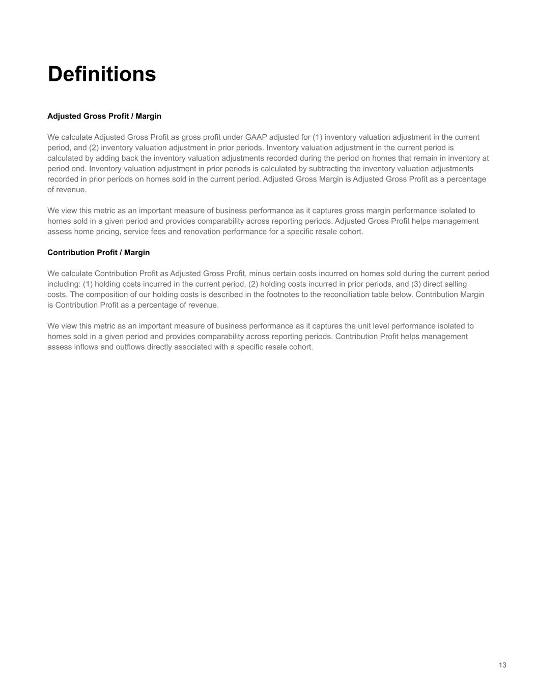 Adjusted Gross Profit / Margin We calculate Adjusted Gross Profit as gross profit under GAAP adjusted for (1) inventory valuation adjustment in the current period, and (2) inventory valuation adjustment in prior periods. Inventory valuation adjustment in the current period is calculated by adding back the inventory valuation adjustments recorded during the period on homes that remain in inventory at period end. Inventory valuation adjustment in prior periods is calculated by subtracting the inventory valuation adjustments recorded in prior periods on homes sold in the current period. Adjusted Gross Margin is Adjusted Gross Profit as a percentage of revenue. We view this metric as an important measure of business performance as it captures gross margin performance isolated to homes sold in a given period and provides comparability across reporting periods. Adjusted Gross Profit helps management assess home pricing, service fees and renovation performance for a specific resale cohort. Contribution Profit / Margin We calculate Contribution Profit as Adjusted Gross Profit, minus certain costs incurred on homes sold during the current period including: (1) holding costs incurred in the current period, (2) holding costs incurred in prior periods, and (3) direct selling costs. The composition of our holding costs is described in the footnotes to the reconciliation table below. Contribution Margin is Contribution Profit as a percentage of revenue. We view this metric as an important measure of business performance as it captures the unit level performance isolated to homes sold in a given period and provides comparability across reporting periods. Contribution Profit helps management assess inflows and outflows directly associated with a specific resale cohort. 13 Definitions