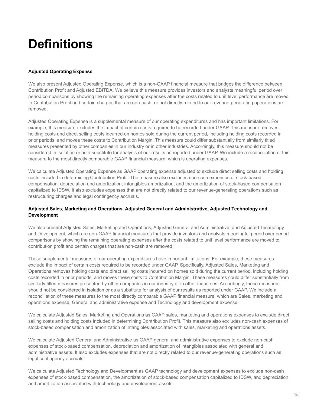 15 Adjusted Operating Expense We also present Adjusted Operating Expense, which is a non-GAAP financial measure that bridges the difference between Contribution Profit and Adjusted EBITDA. We believe this measure provides investors and analysts meaningful period over period comparisons by showing the remaining operating expenses after the costs related to unit level performance are moved to Contribution Profit and certain charges that are non-cash, or not directly related to our revenue-generating operations are removed. Adjusted Operating Expense is a supplemental measure of our operating expenditures and has important limitations. For example, this measure excludes the impact of certain costs required to be recorded under GAAP. This measure removes holding costs and direct selling costs incurred on homes sold during the current period, including holding costs recorded in prior periods, and moves these costs to Contribution Margin. This measure could differ substantially from similarly titled measures presented by other companies in our industry or in other industries. Accordingly, this measure should not be considered in isolation or as a substitute for analysis of our results as reported under GAAP. We include a reconciliation of this measure to the most directly comparable GAAP financial measure, which is operating expenses. We calculate Adjusted Operating Expense as GAAP operating expense adjusted to exclude direct selling costs and holding costs included in determining Contribution Profit. The measure also excludes non-cash expenses of stock-based compensation, depreciation and amortization, intangibles amortization, and the amortization of stock-based compensation capitalized to IDSW. It also excludes expenses that are not directly related to our revenue-generating operations such as restructuring charges and legal contingency accruals. Adjusted Sales, Marketing and Operations, Adjusted General and Administrative, Adjusted Technology and Development We also present Adjusted Sales, Marketing and Operations, Adjusted General and Administrative, and Adjusted Technology and Development, which are non-GAAP financial measures that provide investors and analysts meaningful period over period comparisons by showing the remaining operating expenses after the costs related to unit level performance are moved to contribution profit and certain charges that are non-cash are removed. These supplemental measures of our operating expenditures have important limitations. For example, these measures exclude the impact of certain costs required to be recorded under GAAP. Specifically, Adjusted Sales, Marketing and Operations removes holding costs and direct selling costs incurred on homes sold during the current period, including holding costs recorded in prior periods, and moves these costs to Contribution Margin. These measures could differ substantially from similarly titled measures presented by other companies in our industry or in other industries. Accordingly, these measures should not be considered in isolation or as a substitute for analysis of our results as reported under GAAP. We include a reconciliation of these measures to the most directly comparable GAAP financial measure, which are Sales, marketing and operations expense, General and administrative expense and Technology and development expense. We calculate Adjusted Sales, Marketing and Operations as GAAP sales, marketing and operations expenses to exclude direct selling costs and holding costs included in determining Contribution Profit. This measure also excludes non-cash expenses of stock-based compensation and amortization of intangibles associated with sales, marketing and operations assets. We calculate Adjusted General and Administrative as GAAP general and administrative expenses to exclude non-cash expenses of stock-based compensation, depreciation and amortization of intangibles associated with general and administrative assets. It also excludes expenses that are not directly related to our revenue-generating operations such as legal contingency accruals. We calculate Adjusted Technology and Development as GAAP technology and development expenses to exclude non-cash expenses of stock-based compensation, the amortization of stock-based compensation capitalized to IDSW, and depreciation and amortization associated with technology and development assets. Definitions