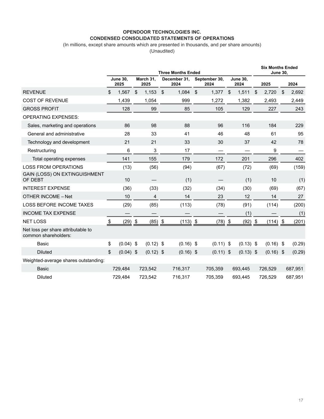 17 Three Months Ended Six Months Ended June 30, June 30, 2025 March 31, 2025 December 31, 2024 September 30, 2024 June 30, 2024 2025 2024 REVENUE $ 1,567 $ 1,153 $ 1,084 $ 1,377 $ 1,511 $ 2,720 $ 2,692 COST OF REVENUE 1,439 1,054 999 1,272 1,382 2,493 2,449 GROSS PROFIT 128 99 85 105 129 227 243 OPERATING EXPENSES: Sales, marketing and operations 86 98 88 96 116 184 229 General and administrative 28 33 41 46 48 61 95 Technology and development 21 21 33 30 37 42 78 Restructuring 6 3 17 — — 9 — Total operating expenses 141 155 179 172 201 296 402 LOSS FROM OPERATIONS (13) (56) (94) (67) (72) (69) (159) GAIN (LOSS) ON EXTINGUISHMENT OF DEBT 10 — (1) — (1) 10 (1) INTEREST EXPENSE (36) (33) (32) (34) (30) (69) (67) OTHER INCOME – Net 10 4 14 23 12 14 27 LOSS BEFORE INCOME TAXES (29) (85) (113) (78) (91) (114) (200) INCOME TAX EXPENSE — — — — (1) — (1) NET LOSS $ (29) $ (85) $ (113) $ (78) $ (92) $ (114) $ (201) Net loss per share attributable to common shareholders: Basic $ (0.04) $ (0.12) $ (0.16) $ (0.11) $ (0.13) $ (0.16) $ (0.29) Diluted $ (0.04) $ (0.12) $ (0.16) $ (0.11) $ (0.13) $ (0.16) $ (0.29) Weighted-average shares outstanding: Basic 729,484 723,542 716,317 705,359 693,445 726,529 687,951 Diluted 729,484 723,542 716,317 705,359 693,445 726,529 687,951 OPENDOOR TECHNOLOGIES INC. CONDENSED CONSOLIDATED STATEMENTS OF OPERATIONS (In millions, except share amounts which are presented in thousands, and per share amounts) (Unaudited)