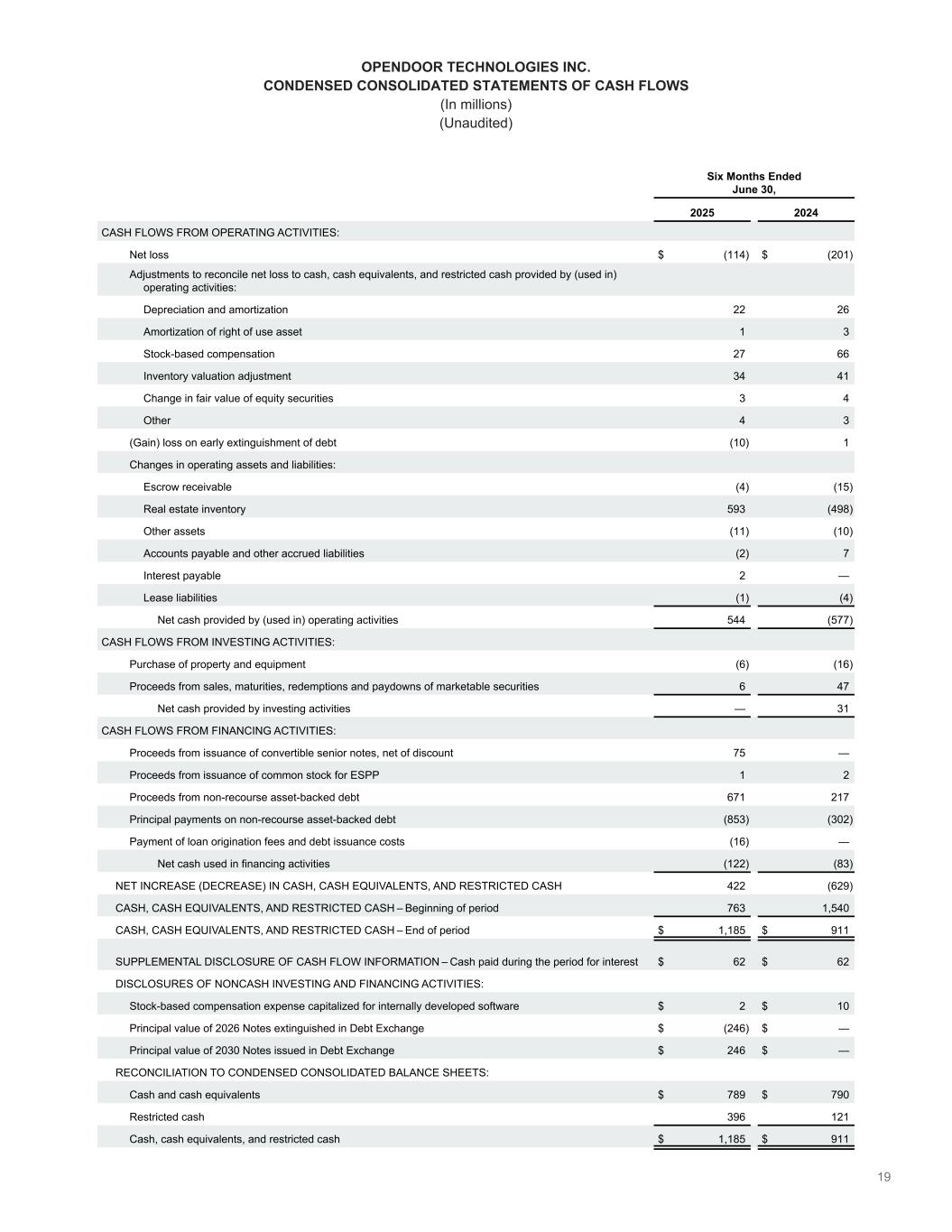 19 OPENDOOR TECHNOLOGIES INC. CONDENSED CONSOLIDATED STATEMENTS OF CASH FLOWS (In millions) (Unaudited) Six Months Ended June 30, 2025 2024 CASH FLOWS FROM OPERATING ACTIVITIES: Net loss $ (114) $ (201) Adjustments to reconcile net loss to cash, cash equivalents, and restricted cash provided by (used in) operating activities: Depreciation and amortization  22 26 Amortization of right of use asset 1 3 Stock-based compensation 27 66 Inventory valuation adjustment 34 41 Change in fair value of equity securities 3 4 Other 4 3 (Gain) loss on early extinguishment of debt (10) 1 Changes in operating assets and liabilities: Escrow receivable (4) (15) Real estate inventory 593 (498) Other assets (11) (10) Accounts payable and other accrued liabilities (2) 7 Interest payable 2 — Lease liabilities (1) (4) Net cash provided by (used in) operating activities 544 (577) CASH FLOWS FROM INVESTING ACTIVITIES: Purchase of property and equipment (6) (16) Proceeds from sales, maturities, redemptions and paydowns of marketable securities 6 47 Net cash provided by investing activities — 31 CASH FLOWS FROM FINANCING ACTIVITIES: Proceeds from issuance of convertible senior notes, net of discount 75 — Proceeds from issuance of common stock for ESPP 1 2 Proceeds from non-recourse asset-backed debt 671 217 Principal payments on non-recourse asset-backed debt (853) (302) Payment of loan origination fees and debt issuance costs (16) — Net cash used in financing activities (122) (83) NET INCREASE (DECREASE) IN CASH, CASH EQUIVALENTS, AND RESTRICTED CASH 422 (629) CASH, CASH EQUIVALENTS, AND RESTRICTED CASH – Beginning of period 763 1,540 CASH, CASH EQUIVALENTS, AND RESTRICTED CASH – End of period $ 1,185 $ 911 SUPPLEMENTAL DISCLOSURE OF CASH FLOW INFORMATION – Cash paid during the period for interest $ 62 $ 62 DISCLOSURES OF NONCASH INVESTING AND FINANCING ACTIVITIES: Stock-based compensation expense capitalized for internally developed software $ 2 $ 10 Principal value of 2026 Notes extinguished in Debt Exchange $ (246) $ — Principal value of 2030 Notes issued in Debt Exchange $ 246 $ — RECONCILIATION TO CONDENSED CONSOLIDATED BALANCE SHEETS: Cash and cash equivalents $ 789 $ 790 Restricted cash 396 121 Cash, cash equivalents, and restricted cash $ 1,185 $ 911