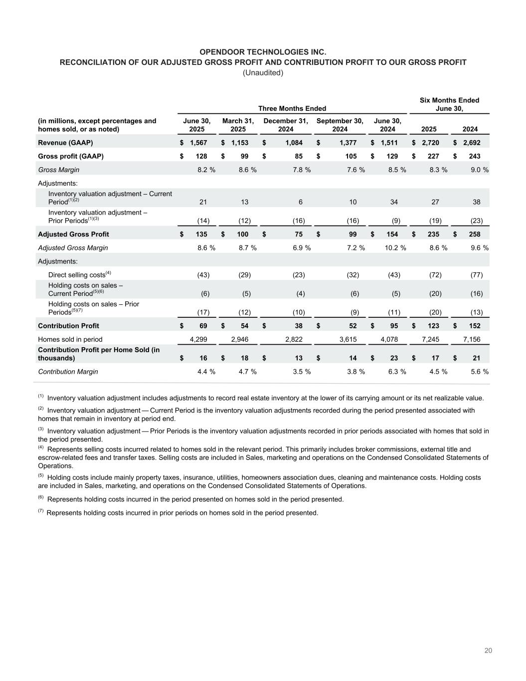 20 OPENDOOR TECHNOLOGIES INC. RECONCILIATION OF OUR ADJUSTED GROSS PROFIT AND CONTRIBUTION PROFIT TO OUR GROSS PROFIT (Unaudited) Three Months Ended Six Months Ended June 30, (in millions, except percentages and homes sold, or as noted) June 30, 2025 March 31, 2025 December 31, 2024 September 30, 2024 June 30, 2024 2025 2024 Revenue (GAAP) $ 1,567 $ 1,153 $ 1,084 $ 1,377 $ 1,511 $ 2,720 $ 2,692 Gross profit (GAAP) $ 128 $ 99 $ 85 $ 105 $ 129 $ 227 $ 243 Gross Margin 8.2 % 8.6 % 7.8 % 7.6 % 8.5 % 8.3 % 9.0 % Adjustments: Inventory valuation adjustment – Current Period͏(1)(2) 21 13 6 10 34 27 38 Inventory valuation adjustment – Prior Periods͏(1)(3) (14) (12) (16) (16) (9) (19) (23) Adjusted Gross Profit $ 135 $ 100 $ 75 $ 99 $ 154 $ 235 $ 258 Adjusted Gross Margin 8.6 % 8.7 % 6.9 % 7.2 % 10.2 % 8.6 % 9.6 % Adjustments: Direct selling costs(4) (43) (29) (23) (32) (43) (72) (77) Holding costs on sales – Current Period͏(5)(6) (6) (5) (4) (6) (5) (20) (16) Holding costs on sales – Prior Periods͏(5)(7) (17) (12) (10) (9) (11) (20) (13) Contribution Profit $ 69 $ 54 $ 38 $ 52 $ 95 $ 123 $ 152 Homes sold in period 4,299 2,946 2,822 3,615 4,078 7,245 7,156 Contribution Profit per Home Sold (in thousands) $ 16 $ 18 $ 13 $ 14 $ 23 $ 17 $ 21 Contribution Margin 4.4 % 4.7 % 3.5 % 3.8 % 6.3 % 4.5 % 5.6 % (1) Inventory valuation adjustment includes adjustments to record real estate inventory at the lower of its carrying amount or its net realizable value. (2) Inventory valuation adjustment — Current Period is the inventory valuation adjustments recorded during the period presented associated with homes that remain in inventory at period end. (3) Inventory valuation adjustment — Prior Periods is the inventory valuation adjustments recorded in prior periods associated with homes that sold in the period presented. (4) Represents selling costs incurred related to homes sold in the relevant period. This primarily includes broker commissions, external title and escrow-related fees and transfer taxes. Selling costs are included in Sales, marketing and operations on the Condensed Consolidated Statements of Operations. (5) Holding costs include mainly property taxes, insurance, utilities, homeowners association dues, cleaning and maintenance costs. Holding costs are included in Sales, marketing, and operations on the Condensed Consolidated Statements of Operations. (6) Represents holding costs incurred in the period presented on homes sold in the period presented. (7) Represents holding costs incurred in prior periods on homes sold in the period presented.
