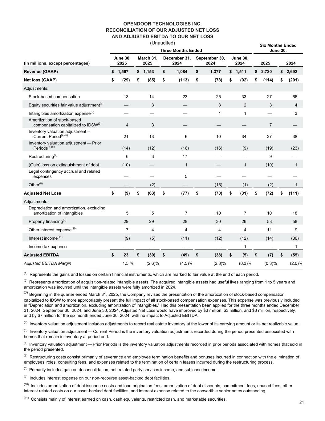 21 OPENDOOR TECHNOLOGIES INC. RECONCILIATION OF OUR ADJUSTED NET LOSS AND ADJUSTED EBITDA TO OUR NET LOSS (Unaudited) Three Months Ended Six Months Ended June 30, (in millions, except percentages) June 30, 2025 March 31, 2025 December 31, 2024 September 30, 2024 June 30, 2024 2025 2024 Revenue (GAAP) $ 1,567 $ 1,153 $ 1,084 $ 1,377 $ 1,511 $ 2,720 $ 2,692 Net loss (GAAP) $ (29) $ (85) $ (113) $ (78) $ (92) $ (114) $ (201) Adjustments: Stock-based compensation 13 14 23 25 33 27 66 Equity securities fair value adjustment(1) — 3 — 3 2 3 4 Intangibles amortization expense(2) — — — 1 1 — 3 Amortization of stock-based compensation capitalized to IDSW(3) 4 3 — — — 7 — Inventory valuation adjustment – Current Period͏(4)(5) 21 13 6 10 34 27 38 Inventory valuation adjustment — Prior Periods͏(4)(6) (14) (12) (16) (16) (9) (19) (23) Restructuring(7) 6 3 17 — — 9 — (Gain) loss on extinguishment of debt (10) — 1 — 1 (10) 1 Legal contingency accrual and related expenses — — 5 — — — — Other(8) — (2) — (15) (1) (2) 1 Adjusted Net Loss $ (9) $ (63) $ (77) $ (70) $ (31) $ (72) $ (111) Adjustments: Depreciation and amortization, excluding amortization of intangibles 5 5 7 10 7 10 18 Property financing(9) 29 29 28 30 26 58 58 Other interest expense(10) 7 4 4 4 4 11 9 Interest income(11) (9) (5) (11) (12) (12) (14) (30) Income tax expense — — — — 1 — 1 Adjusted EBITDA $ 23 $ (30) $ (49) $ (38) $ (5) $ (7) $ (55) Adjusted EBITDA Margin 1.5 % (2.6) % (4.5) % (2.8) % (0.3) % (0.3) % (2.0) % (1) Represents the gains and losses on certain financial instruments, which are marked to fair value at the end of each period. (2) Represents amortization of acquisition-related intangible assets. The acquired intangible assets had useful lives ranging from 1 to 5 years and amortization was incurred until the intangible assets were fully amortized in 2024. (3) Beginning in the quarter ended March 31, 2025, the Company revised the presentation of the amortization of stock-based compensation capitalized to IDSW to more appropriately present the full impact of all stock-based compensation expenses. This expense was previously included in “Depreciation and amortization, excluding amortization of intangibles.” Had this presentation been applied for the three months ended December 31, 2024, September 30, 2024, and June 30, 2024, Adjusted Net Loss would have improved by $3 million, $3 million, and $3 million, respectively, and by $7 million for the six month ended June 30, 2024, with no impact to Adjusted EBITDA. (4) Inventory valuation adjustment includes adjustments to record real estate inventory at the lower of its carrying amount or its net realizable value. (5) Inventory valuation adjustment — Current Period is the inventory valuation adjustments recorded during the period presented associated with homes that remain in inventory at period end. (6) Inventory valuation adjustment — Prior Periods is the inventory valuation adjustments recorded in prior periods associated with homes that sold in the period presented. (7) Restructuring costs consist primarily of severance and employee termination benefits and bonuses incurred in connection with the elimination of employees’ roles, consulting fees, and expenses related to the termination of certain leases incurred during the restructuring process. (8) Primarily includes gain on deconsolidation, net, related party services income, and sublease income. (9) Includes interest expense on our non-recourse asset-backed debt facilities. (10) Includes amortization of debt issuance costs and loan origination fees, amortization of debt discounts, commitment fees, unused fees, other interest related costs on our asset-backed debt facilities, and interest expense related to the convertible senior notes outstanding. (11) Consists mainly of interest earned on cash, cash equivalents, restricted cash, and marketable securities.