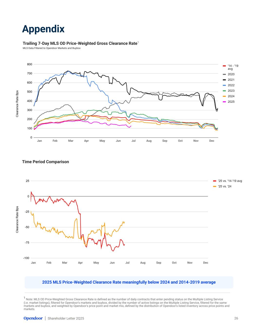 Shareholder Letter 2Q25 Appendix Trailing 7-Day MLS Clearance Rate1 MLS Data Filtered to Opendoor Markets and Buybox 25 Jan Feb Mar Apr May Jun Jul Aug Sep Oct Nov Dec 1 Note: MLS Clearance Rate is defined as the number of daily contracts that enter pending status on the Multiple Listing Service (i.e. market listings), filtered for Opendoor’s markets and buybox, divided by the number of active listings on the Multiple Listing Service, filtered for the same markets and buybox. Time Period Comparison Jan Feb Mar Apr May Jun Jul Aug Sep Oct Nov Dec 2025 MLS Clearance Rate currently below 2024 and 2014-2019 average