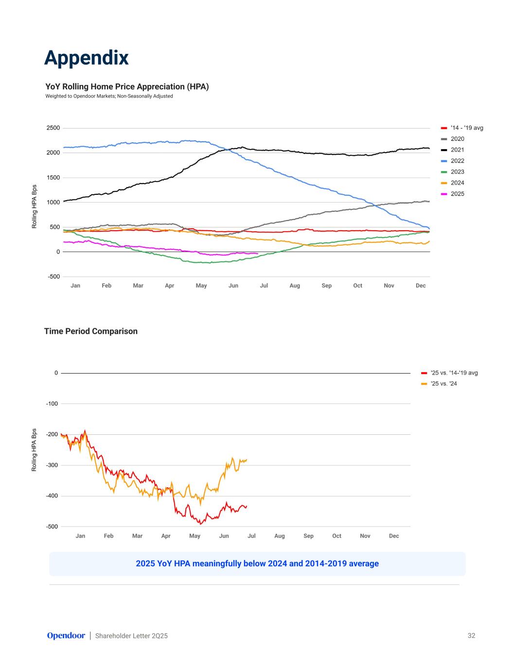 Shareholder Letter 2Q25 Jan Feb Mar Apr May Jun Jul Aug Sep Oct Nov Dec Appendix 30-Day Rolling Home Price Appreciation (HPA) Weighted to Opendoor Markets; Non-Seasonally Adjusted 31 Time Period Comparison Jan Feb Mar Apr May Jun Jul Aug Sep Oct Nov Dec 2025 30-Day HPA compared to 2024 and 2014-2019 average