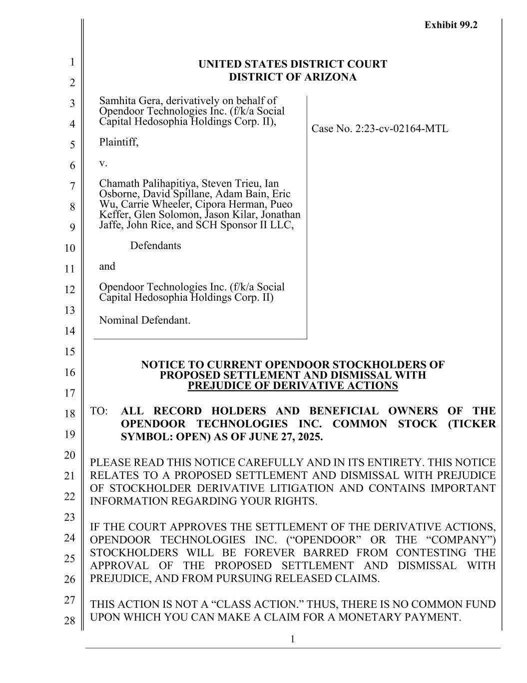 1 1 2 3 4 5 6 7 8 9 10 11 12 13 14 15 16 17 18 19 20 21 22 23 24 25 26 27 28 UNITED STATES DISTRICT COURT DISTRICT OF ARIZONA Samhita Gera, derivatively on behalf of Opendoor Technologies Inc. (f/k/a Social Capital Hedosophia Holdings Corp. II), Plaintiff, v. Chamath Palihapitiya, Steven Trieu, Ian Osborne, David Spillane, Adam Bain, Eric Wu, Carrie Wheeler, Cipora Herman, Pueo Keffer, Glen Solomon, Jason Kilar, Jonathan Jaffe, John Rice, and SCH Sponsor II LLC, Defendants and Opendoor Technologies Inc. (f/k/a Social Capital Hedosophia Holdings Corp. II) Nominal Defendant. Case No. 2:23-cv-02164-MTL NOTICE TO CURRENT OPENDOOR STOCKHOLDERS OF PROPOSED SETTLEMENT AND DISMISSAL WITH PREJUDICE OF DERIVATIVE ACTIONS TO: ALL RECORD HOLDERS AND BENEFICIAL OWNERS OF THE OPENDOOR TECHNOLOGIES INC. COMMON STOCK (TICKER SYMBOL: OPEN) AS OF JUNE 27, 2025. PLEASE READ THIS NOTICE CAREFULLY AND IN ITS ENTIRETY. THIS NOTICE RELATES TO A PROPOSED SETTLEMENT AND DISMISSAL WITH PREJUDICE OF STOCKHOLDER DERIVATIVE LITIGATION AND CONTAINS IMPORTANT INFORMATION REGARDING YOUR RIGHTS. IF THE COURT APPROVES THE SETTLEMENT OF THE DERIVATIVE ACTIONS, OPENDOOR TECHNOLOGIES INC. (“OPENDOOR” OR THE “COMPANY”) STOCKHOLDERS WILL BE FOREVER BARRED FROM CONTESTING THE APPROVAL OF THE PROPOSED SETTLEMENT AND DISMISSAL WITH PREJUDICE, AND FROM PURSUING RELEASED CLAIMS. THIS ACTION IS NOT A “CLASS ACTION.” THUS, THERE IS NO COMMON FUND UPON WHICH YOU CAN MAKE A CLAIM FOR A MONETARY PAYMENT. Exhibit 99.2