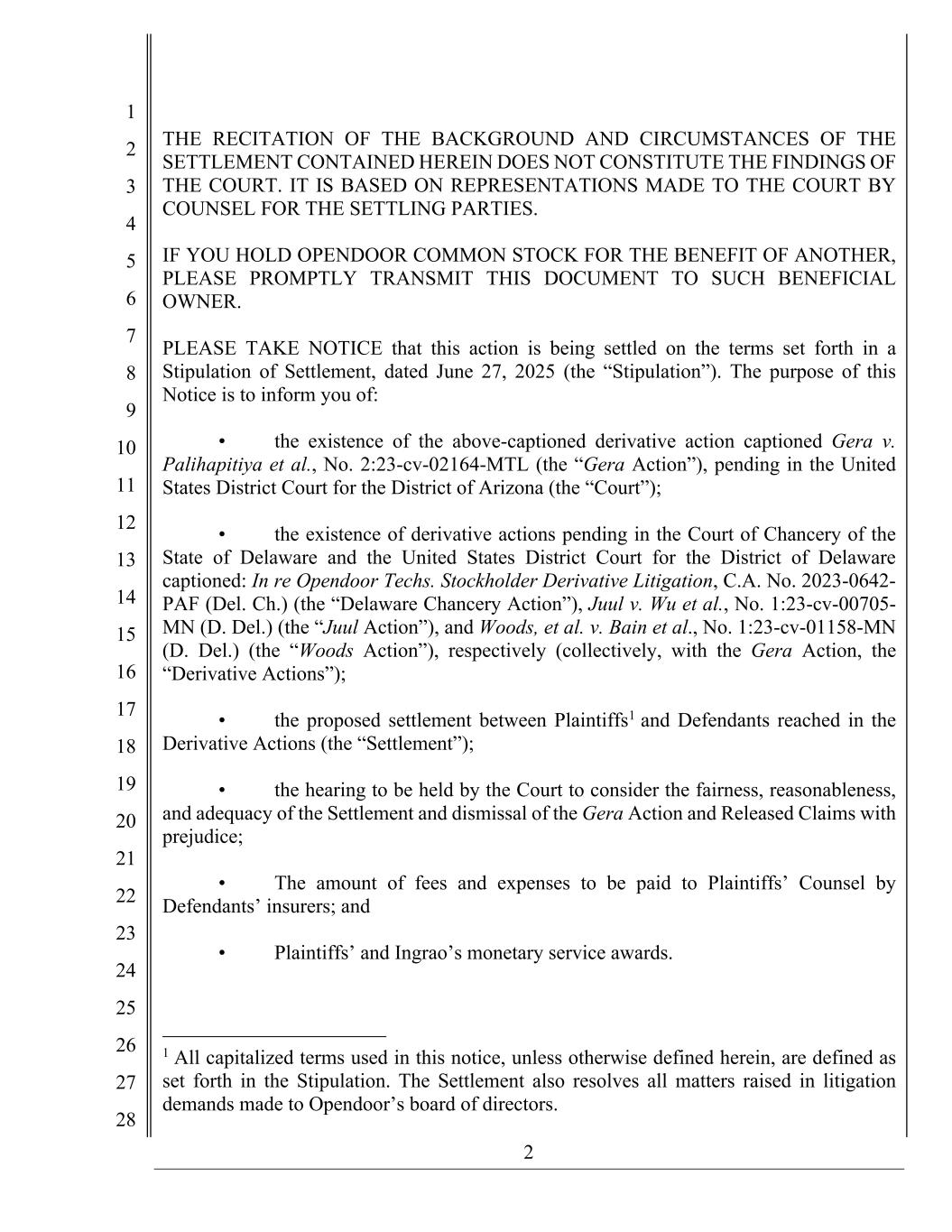 2 1 2 3 4 5 6 7 8 9 10 11 12 13 14 15 16 17 18 19 20 21 22 23 24 25 26 27 28 THE RECITATION OF THE BACKGROUND AND CIRCUMSTANCES OF THE SETTLEMENT CONTAINED HEREIN DOES NOT CONSTITUTE THE FINDINGS OF THE COURT. IT IS BASED ON REPRESENTATIONS MADE TO THE COURT BY COUNSEL FOR THE SETTLING PARTIES. IF YOU HOLD OPENDOOR COMMON STOCK FOR THE BENEFIT OF ANOTHER, PLEASE PROMPTLY TRANSMIT THIS DOCUMENT TO SUCH BENEFICIAL OWNER. PLEASE TAKE NOTICE that this action is being settled on the terms set forth in a Stipulation of Settlement, dated June 27, 2025 (the “Stipulation”). The purpose of this Notice is to inform you of: • the existence of the above-captioned derivative action captioned Gera v. Palihapitiya et al., No. 2:23-cv-02164-MTL (the “Gera Action”), pending in the United States District Court for the District of Arizona (the “Court”); • the existence of derivative actions pending in the Court of Chancery of the State of Delaware and the United States District Court for the District of Delaware captioned: In re Opendoor Techs. Stockholder Derivative Litigation, C.A. No. 2023-0642- PAF (Del. Ch.) (the “Delaware Chancery Action”), Juul v. Wu et al., No. 1:23-cv-00705- MN (D. Del.) (the “Juul Action”), and Woods, et al. v. Bain et al., No. 1:23-cv-01158-MN (D. Del.) (the “Woods Action”), respectively (collectively, with the Gera Action, the “Derivative Actions”); • the proposed settlement between Plaintiffs1 and Defendants reached in the Derivative Actions (the “Settlement”); • the hearing to be held by the Court to consider the fairness, reasonableness, and adequacy of the Settlement and dismissal of the Gera Action and Released Claims with prejudice; • The amount of fees and expenses to be paid to Plaintiffs’ Counsel by Defendants’ insurers; and • Plaintiffs’ and Ingrao’s monetary service awards. 1 All capitalized terms used in this notice, unless otherwise defined herein, are defined as set forth in the Stipulation. The Settlement also resolves all matters raised in litigation demands made to Opendoor’s board of directors.