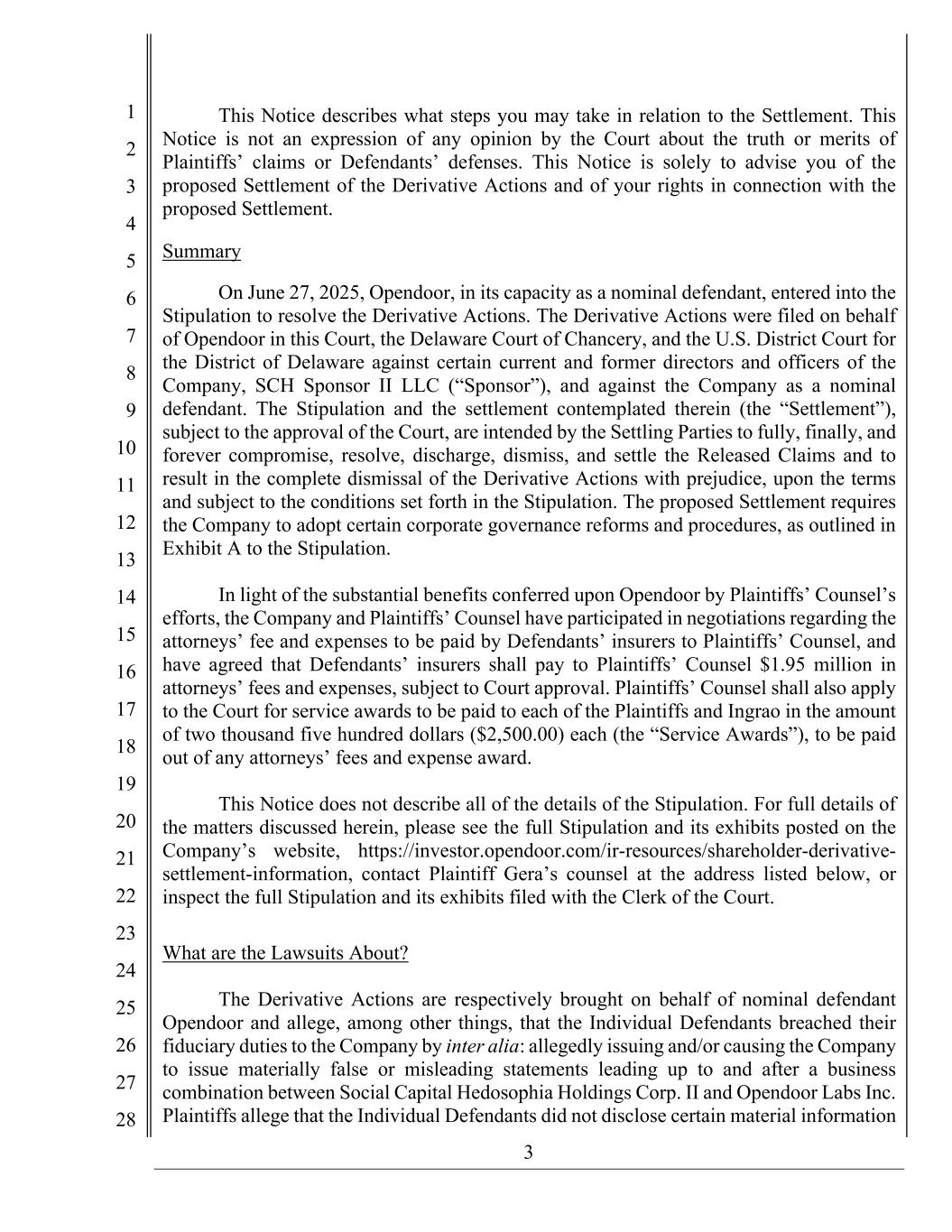 3 1 2 3 4 5 6 7 8 9 10 11 12 13 14 15 16 17 18 19 20 21 22 23 24 25 26 27 28 This Notice describes what steps you may take in relation to the Settlement. This Notice is not an expression of any opinion by the Court about the truth or merits of Plaintiffs’ claims or Defendants’ defenses. This Notice is solely to advise you of the proposed Settlement of the Derivative Actions and of your rights in connection with the proposed Settlement. Summary On June 27, 2025, Opendoor, in its capacity as a nominal defendant, entered into the Stipulation to resolve the Derivative Actions. The Derivative Actions were filed on behalf of Opendoor in this Court, the Delaware Court of Chancery, and the U.S. District Court for the District of Delaware against certain current and former directors and officers of the Company, SCH Sponsor II LLC (“Sponsor”), and against the Company as a nominal defendant. The Stipulation and the settlement contemplated therein (the “Settlement”), subject to the approval of the Court, are intended by the Settling Parties to fully, finally, and forever compromise, resolve, discharge, dismiss, and settle the Released Claims and to result in the complete dismissal of the Derivative Actions with prejudice, upon the terms and subject to the conditions set forth in the Stipulation. The proposed Settlement requires the Company to adopt certain corporate governance reforms and procedures, as outlined in Exhibit A to the Stipulation. In light of the substantial benefits conferred upon Opendoor by Plaintiffs’ Counsel’s efforts, the Company and Plaintiffs’ Counsel have participated in negotiations regarding the attorneys’ fee and expenses to be paid by Defendants’ insurers to Plaintiffs’ Counsel, and have agreed that Defendants’ insurers shall pay to Plaintiffs’ Counsel $1.95 million in attorneys’ fees and expenses, subject to Court approval. Plaintiffs’ Counsel shall also apply to the Court for service awards to be paid to each of the Plaintiffs and Ingrao in the amount of two thousand five hundred dollars ($2,500.00) each (the “Service Awards”), to be paid out of any attorneys’ fees and expense award. This Notice does not describe all of the details of the Stipulation. For full details of the matters discussed herein, please see the full Stipulation and its exhibits posted on the Company’s website, https://investor.opendoor.com/ir-resources/shareholder-derivative- settlement-information, contact Plaintiff Gera’s counsel at the address listed below, or inspect the full Stipulation and its exhibits filed with the Clerk of the Court. What are the Lawsuits About? The Derivative Actions are respectively brought on behalf of nominal defendant Opendoor and allege, among other things, that the Individual Defendants breached their fiduciary duties to the Company by inter alia: allegedly issuing and/or causing the Company to issue materially false or misleading statements leading up to and after a business combination between Social Capital Hedosophia Holdings Corp. II and Opendoor Labs Inc. Plaintiffs allege that the Individual Defendants did not disclose certain material information