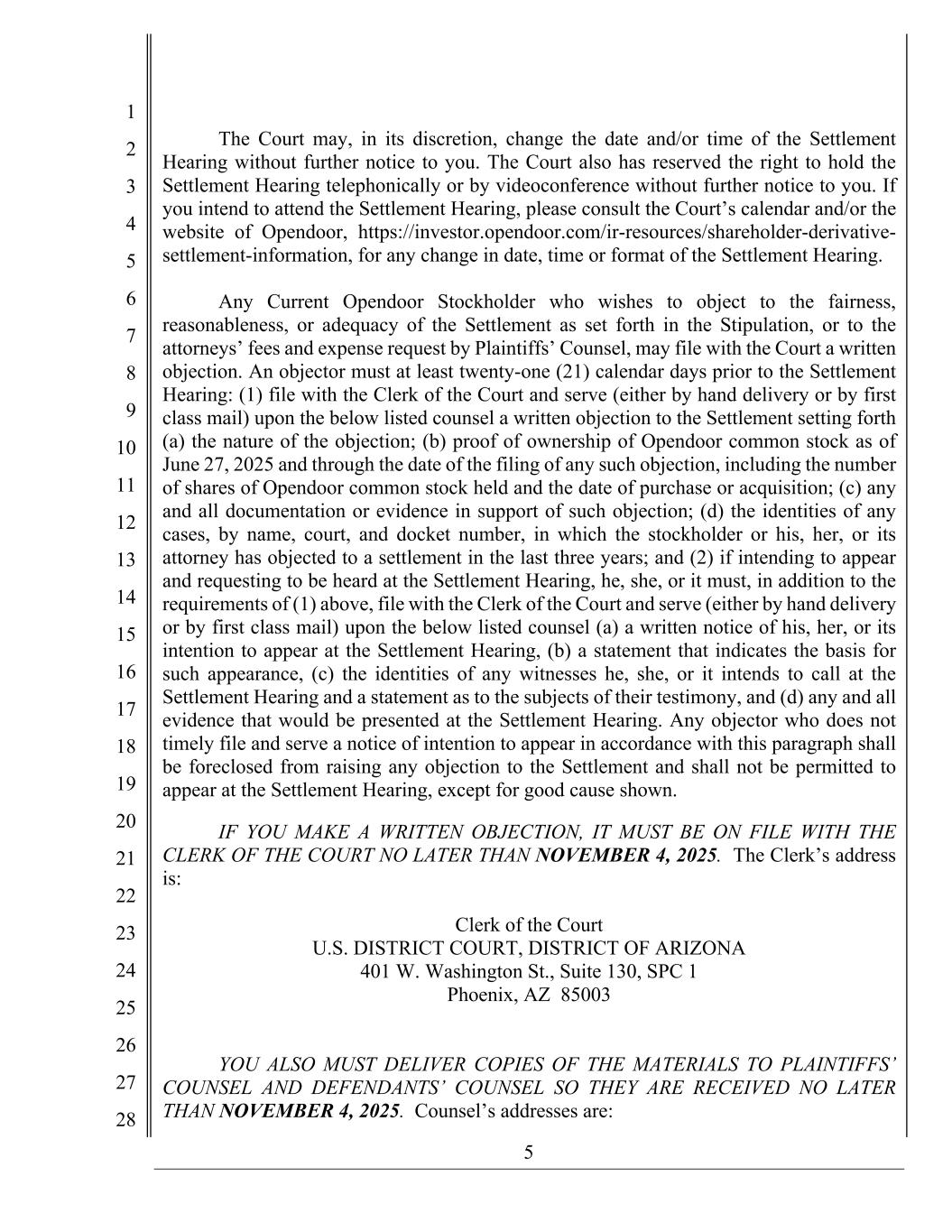 5 1 2 3 4 5 6 7 8 9 10 11 12 13 14 15 16 17 18 19 20 21 22 23 24 25 26 27 28 The Court may, in its discretion, change the date and/or time of the Settlement Hearing without further notice to you. The Court also has reserved the right to hold the Settlement Hearing telephonically or by videoconference without further notice to you. If you intend to attend the Settlement Hearing, please consult the Court’s calendar and/or the website of Opendoor, https://investor.opendoor.com/ir-resources/shareholder-derivative- settlement-information, for any change in date, time or format of the Settlement Hearing. Any Current Opendoor Stockholder who wishes to object to the fairness, reasonableness, or adequacy of the Settlement as set forth in the Stipulation, or to the attorneys’ fees and expense request by Plaintiffs’ Counsel, may file with the Court a written objection. An objector must at least twenty-one (21) calendar days prior to the Settlement Hearing: (1) file with the Clerk of the Court and serve (either by hand delivery or by first class mail) upon the below listed counsel a written objection to the Settlement setting forth (a) the nature of the objection; (b) proof of ownership of Opendoor common stock as of June 27, 2025 and through the date of the filing of any such objection, including the number of shares of Opendoor common stock held and the date of purchase or acquisition; (c) any and all documentation or evidence in support of such objection; (d) the identities of any cases, by name, court, and docket number, in which the stockholder or his, her, or its attorney has objected to a settlement in the last three years; and (2) if intending to appear and requesting to be heard at the Settlement Hearing, he, she, or it must, in addition to the requirements of (1) above, file with the Clerk of the Court and serve (either by hand delivery or by first class mail) upon the below listed counsel (a) a written notice of his, her, or its intention to appear at the Settlement Hearing, (b) a statement that indicates the basis for such appearance, (c) the identities of any witnesses he, she, or it intends to call at the Settlement Hearing and a statement as to the subjects of their testimony, and (d) any and all evidence that would be presented at the Settlement Hearing. Any objector who does not timely file and serve a notice of intention to appear in accordance with this paragraph shall be foreclosed from raising any objection to the Settlement and shall not be permitted to appear at the Settlement Hearing, except for good cause shown. IF YOU MAKE A WRITTEN OBJECTION, IT MUST BE ON FILE WITH THE CLERK OF THE COURT NO LATER THAN NOVEMBER 4, 2025. The Clerk’s address is: Clerk of the Court U.S. DISTRICT COURT, DISTRICT OF ARIZONA 401 W. Washington St., Suite 130, SPC 1 Phoenix, AZ 85003 YOU ALSO MUST DELIVER COPIES OF THE MATERIALS TO PLAINTIFFS’ COUNSEL AND DEFENDANTS’ COUNSEL SO THEY ARE RECEIVED NO LATER THAN NOVEMBER 4, 2025. Counsel’s addresses are: