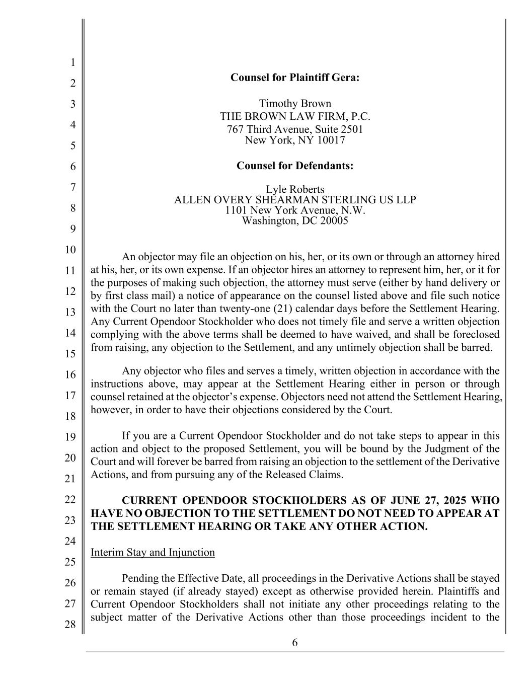 6 1 2 3 4 5 6 7 8 9 10 11 12 13 14 15 16 17 18 19 20 21 22 23 24 25 26 27 28 Counsel for Plaintiff Gera: Timothy Brown THE BROWN LAW FIRM, P.C. 767 Third Avenue, Suite 2501 New York, NY 10017 Counsel for Defendants: Lyle Roberts ALLEN OVERY SHEARMAN STERLING US LLP 1101 New York Avenue, N.W. Washington, DC 20005 An objector may file an objection on his, her, or its own or through an attorney hired at his, her, or its own expense. If an objector hires an attorney to represent him, her, or it for the purposes of making such objection, the attorney must serve (either by hand delivery or by first class mail) a notice of appearance on the counsel listed above and file such notice with the Court no later than twenty-one (21) calendar days before the Settlement Hearing. Any Current Opendoor Stockholder who does not timely file and serve a written objection complying with the above terms shall be deemed to have waived, and shall be foreclosed from raising, any objection to the Settlement, and any untimely objection shall be barred. Any objector who files and serves a timely, written objection in accordance with the instructions above, may appear at the Settlement Hearing either in person or through counsel retained at the objector’s expense. Objectors need not attend the Settlement Hearing, however, in order to have their objections considered by the Court. If you are a Current Opendoor Stockholder and do not take steps to appear in this action and object to the proposed Settlement, you will be bound by the Judgment of the Court and will forever be barred from raising an objection to the settlement of the Derivative Actions, and from pursuing any of the Released Claims. CURRENT OPENDOOR STOCKHOLDERS AS OF JUNE 27, 2025 WHO HAVE NO OBJECTION TO THE SETTLEMENT DO NOT NEED TO APPEAR AT THE SETTLEMENT HEARING OR TAKE ANY OTHER ACTION. Interim Stay and Injunction Pending the Effective Date, all proceedings in the Derivative Actions shall be stayed or remain stayed (if already stayed) except as otherwise provided herein. Plaintiffs and Current Opendoor Stockholders shall not initiate any other proceedings relating to the subject matter of the Derivative Actions other than those proceedings incident to the