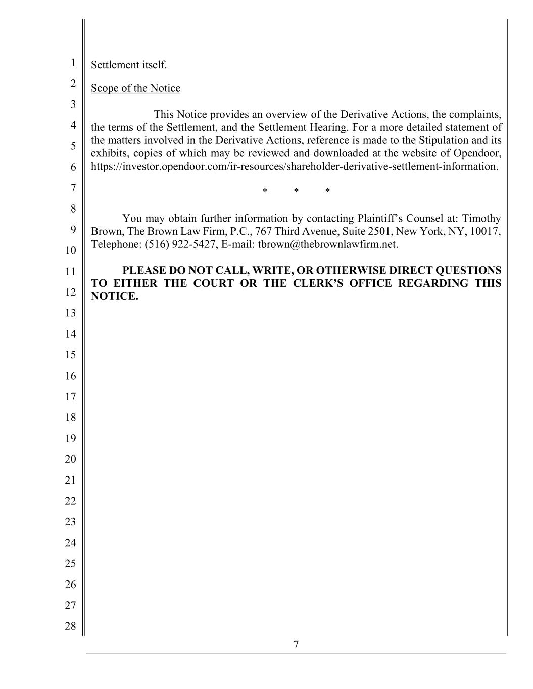 7 1 2 3 4 5 6 7 8 9 10 11 12 13 14 15 16 17 18 19 20 21 22 23 24 25 26 27 28 Settlement itself. Scope of the Notice This Notice provides an overview of the Derivative Actions, the complaints, the terms of the Settlement, and the Settlement Hearing. For a more detailed statement of the matters involved in the Derivative Actions, reference is made to the Stipulation and its exhibits, copies of which may be reviewed and downloaded at the website of Opendoor, https://investor.opendoor.com/ir-resources/shareholder-derivative-settlement-information. * * * You may obtain further information by contacting Plaintiff’s Counsel at: Timothy Brown, The Brown Law Firm, P.C., 767 Third Avenue, Suite 2501, New York, NY, 10017, Telephone: (516) 922-5427, E-mail: tbrown@thebrownlawfirm.net. PLEASE DO NOT CALL, WRITE, OR OTHERWISE DIRECT QUESTIONS TO EITHER THE COURT OR THE CLERK’S OFFICE REGARDING THIS NOTICE.