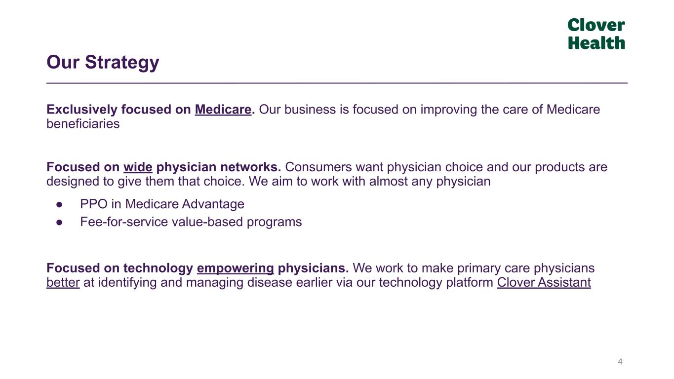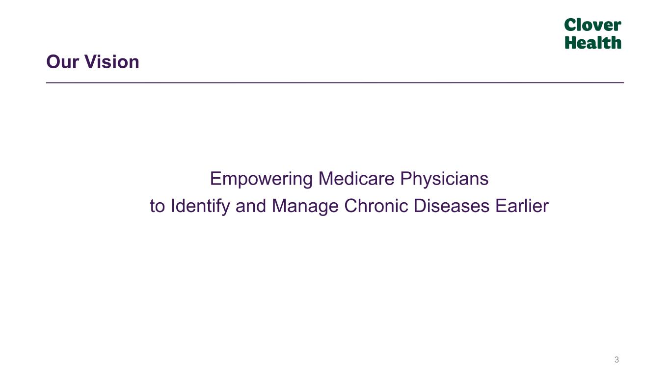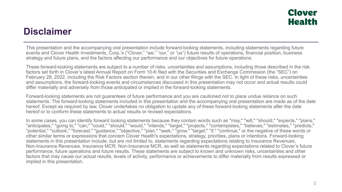 2 This presentation and the accompanying oral presentation include forward-looking statements, including statements regarding future events and Clover Health Investments, Corp.’s (“Clover,” “we,” “our,” or “us”) future results of operations, financial position, business strategy and future plans, and the factors affecting our performance and our objectives for future operations. These forward-looking statements are subject to a number of risks, uncertainties and assumptions, including those described in the risk factors set forth in Clover’s latest Annual Report on Form 10-K filed with the Securities and Exchange Commission (the “SEC”) on February 28, 2022, including the Risk Factors section therein, and in our other filings with the SEC. In light of these risks, uncertainties and assumptions, the forward-looking events and circumstances discussed in this presentation may not occur and actual results could differ materially and adversely from those anticipated or implied in the forward-looking statements. Forward-looking statements are not guarantees of future performance and you are cautioned not to place undue reliance on such statements. The forward-looking statements included in this presentation and the accompanying oral presentation are made as of the date hereof. Except as required by law, Clover undertakes no obligation to update any of these forward-looking statements after the date hereof or to conform these statements to actual results or revised expectations. In some cases, you can identify forward looking statements because they contain words such as "may," "will," "should," "expects," "plans," "anticipates," "going to," "can," "could," "should," "would," "intends," "target," "projects," "contemplates," "believes," "estimates," "predicts," "potential," "outlook," "forecast," "guidance," "objective," "plan," "seek," "grow," "target," "if," "continue," or the negative of these words or other similar terms or expressions that concern Clover Health's expectations, strategy, priorities, plans or intentions. Forward-looking statements in this presentation include, but are not limited to, statements regarding expectations relating to Insurance Revenues, Non-Insurance Revenues, Insurance MCR, Non-Insurance MCR, as well as statements regarding expectations related to Clover’s future performance, future operations and future results. These statements are subject to known and unknown risks, uncertainties and other factors that may cause our actual results, levels of activity, performance or achievements to differ materially from results expressed or implied in this presentation. Disclaimer