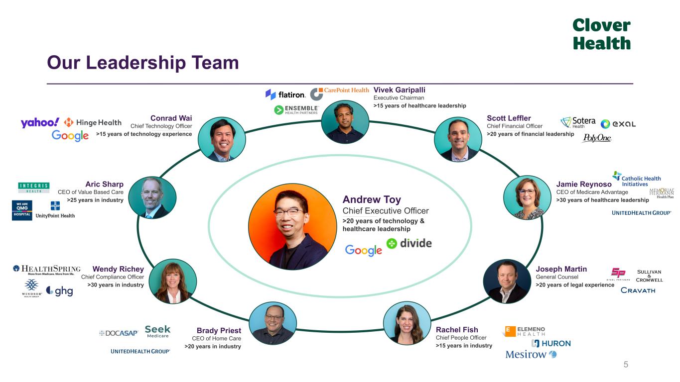 4 Our Strategy Exclusively focused on Medicare. Our business is focused on improving the care of Medicare beneficiaries Focused on wide physician networks. Consumers want physician choice and our products are designed to give them that choice. We aim to work with almost any physician ● PPO in Medicare Advantage ● Fee-for-service value-based programs Focused on technology empowering physicians. We work to make primary care physicians better at identifying and managing disease earlier via our technology platform Clover Assistant