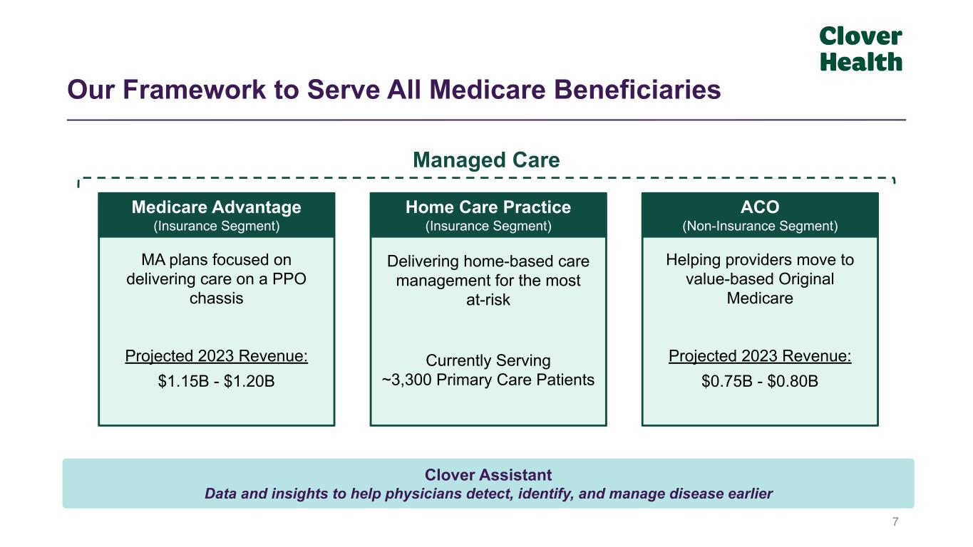 6 Medicare Market Growing and Medicare Advantage Segment Growing Even Faster Source: U.S. Census Bureau - Population Estimates and Projections, Statista, Association of American Medical Colleges (AAMC), CMS, Kaiser Family Foundation. Note: Senior population in millions, Medicare spend in billions of dollars. Senior Population (Aged 65+) in the U.S. Projected Medicare Spending in the U.S.