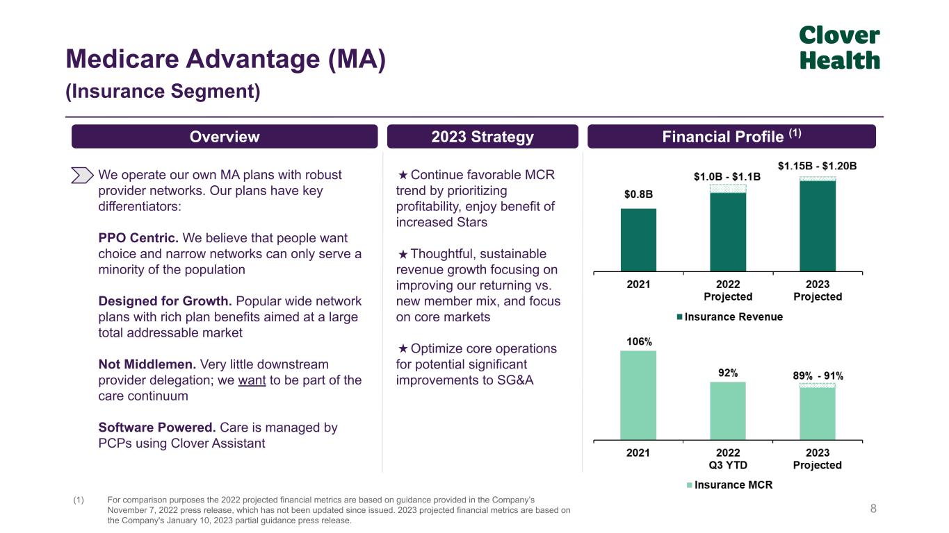 7 Our Framework to Serve All Medicare Beneficiaries MA plans focused on delivering care on a PPO chassis Projected 2023 Revenue: $1.15B - $1.20B Clover Assistant Data and insights to help physicians detect, identify, and manage disease earlier Medicare Advantage (Insurance Segment) Helping providers move to value-based Original Medicare Projected 2023 Revenue: $0.75B - $0.80B ACO (Non-Insurance Segment) Delivering home-based care management for the most at-risk Currently Serving ~3,300 Primary Care Patients Home Care Practice (Insurance Segment) Managed Care