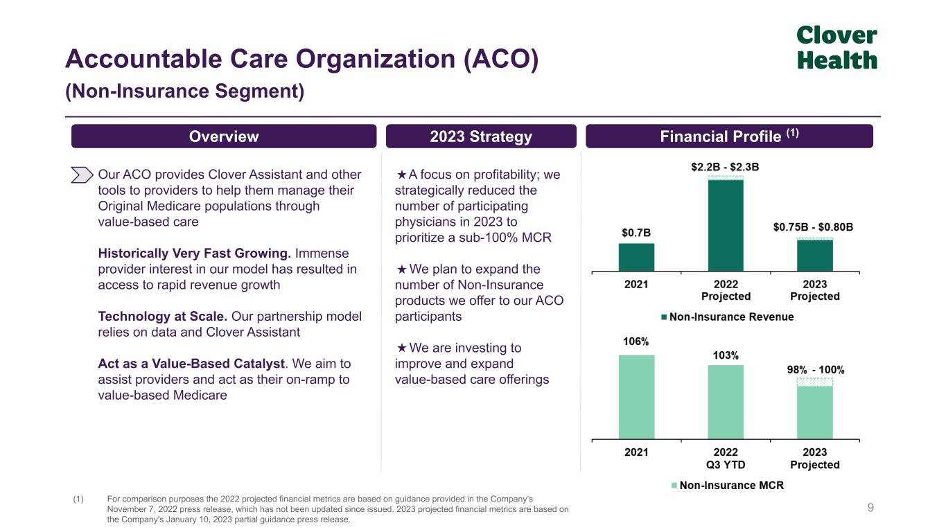 8 Medicare Advantage (MA) (Insurance Segment) We operate our own MA plans with robust provider networks. Our plans have key differentiators: PPO Centric. We believe that people want choice and narrow networks can only serve a minority of the population Designed for Growth. Popular wide network plans with rich plan benefits aimed at a large total addressable market Not Middlemen. Very little downstream provider delegation; we want to be part of the care continuum Software Powered. Care is managed by PCPs using Clover Assistant Continue favorable MCR trend by prioritizing profitability, enjoy benefit of increased Stars Thoughtful, sustainable revenue growth focusing on improving our returning vs. new member mix, and focus on core markets Optimize core operations for potential significant improvements to SG&A 2023 Strategy Financial Profile (1)Overview (1) For comparison purposes the 2022 projected financial metrics are based on guidance provided in the Company’s November 7, 2022 press release, which has not been updated since issued. 2023 projected financial metrics are based on the Company's January 10, 2023 partial guidance press release.