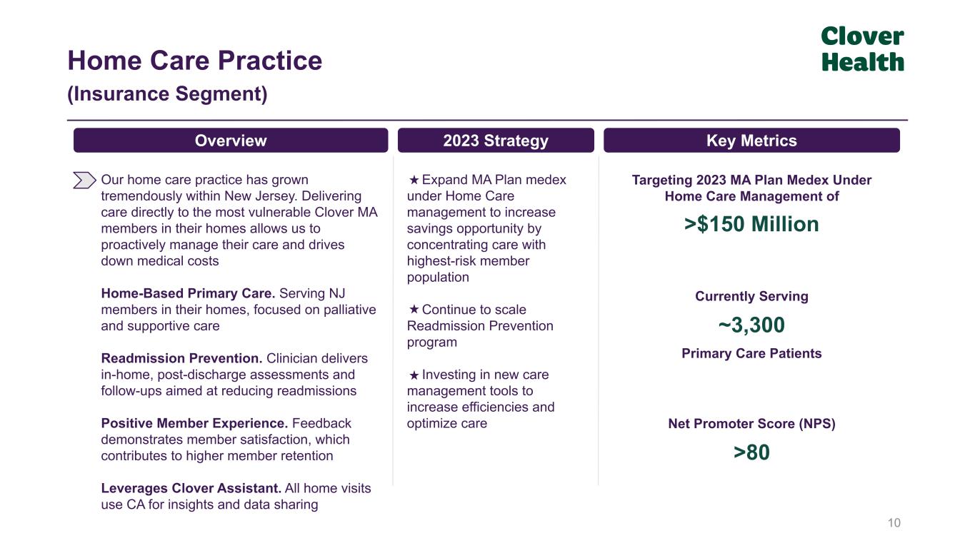 Our ACO provides Clover Assistant and other tools to providers to help them manage their Original Medicare populations through value-based care Historically Very Fast Growing. Immense provider interest in our model has resulted in access to rapid revenue growth Technology at Scale. Our partnership model relies on data and Clover Assistant Act as a Value-Based Catalyst. We aim to assist providers and act as their on-ramp to value-based Medicare 9 A focus on profitability; we strategically reduced the number of participating physicians in 2023 to prioritize a sub-100% MCR We plan to expand the number of Non-Insurance products we offer to our ACO participants We are investing to improve and expand value-based care offerings 2023 Strategy Financial Profile (1)Overview Accountable Care Organization (ACO) (Non-Insurance Segment) (1) For comparison purposes the 2022 projected financial metrics are based on guidance provided in the Company’s November 7, 2022 press release, which has not been updated since issued. 2023 projected financial metrics are based on the Company's January 10, 2023 partial guidance press release.