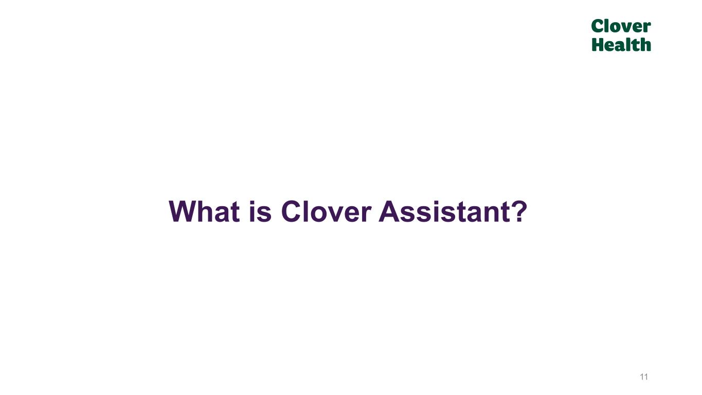 Currently Serving Primary Care Patients 10 Our home care practice has grown tremendously within New Jersey. Delivering care directly to the most vulnerable Clover MA members in their homes allows us to proactively manage their care and drives down medical costs Home-Based Primary Care. Serving NJ members in their homes, focused on palliative and supportive care Readmission Prevention. Clinician delivers in-home, post-discharge assessments and follow-ups aimed at reducing readmissions Positive Member Experience. Feedback demonstrates member satisfaction, which contributes to higher member retention Leverages Clover Assistant. All home visits use CA for insights and data sharing Expand MA Plan medex under Home Care management to increase savings opportunity by concentrating care with highest-risk member population Continue to scale Readmission Prevention program Investing in new care management tools to increase efficiencies and optimize care 2023 Strategy Key MetricsOverview Targeting 2023 MA Plan Medex Under Home Care Management of >$150 Million Home Care Practice (Insurance Segment) ~3,300 Net Promoter Score (NPS) >80