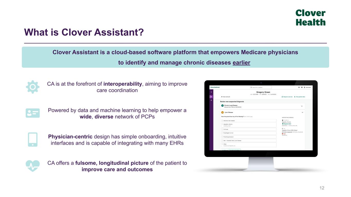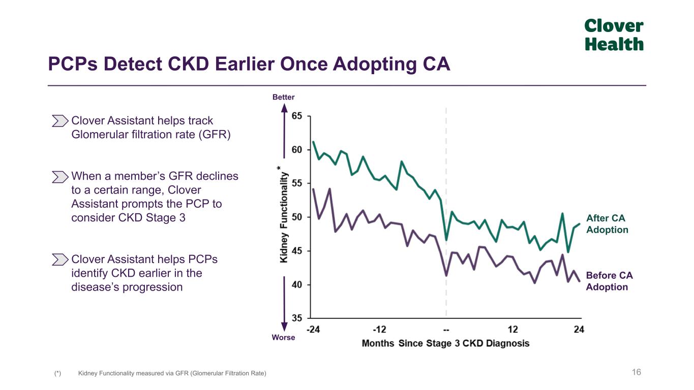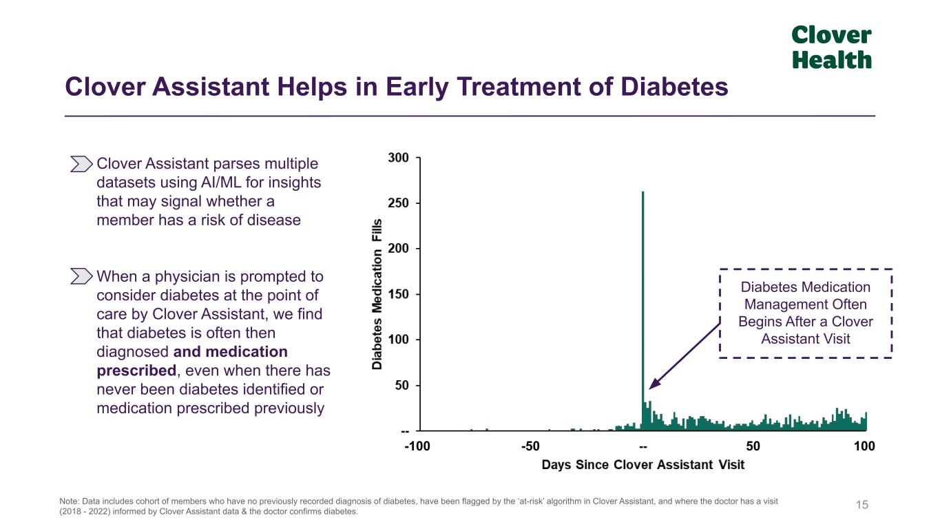 Clover Assistant Helps in Early Treatment of Diabetes 15 -100 100 Diabetes Medication Management Often Begins After a Clover Assistant Visit 50-50 Note: Data includes cohort of members who have no previously recorded diagnosis of diabetes, have been flagged by the ‘at-risk’ algorithm in Clover Assistant, and where the doctor has a visit (2018 - 2022) informed by Clover Assistant data & the doctor confirms diabetes. Clover Assistant parses multiple datasets using AI/ML for insights that may signal whether a member has a risk of disease When a physician is prompted to consider diabetes at the point of care by Clover Assistant, we find that diabetes is often then diagnosed and medication prescribed, even when there has never been diabetes identified or medication prescribed previously
