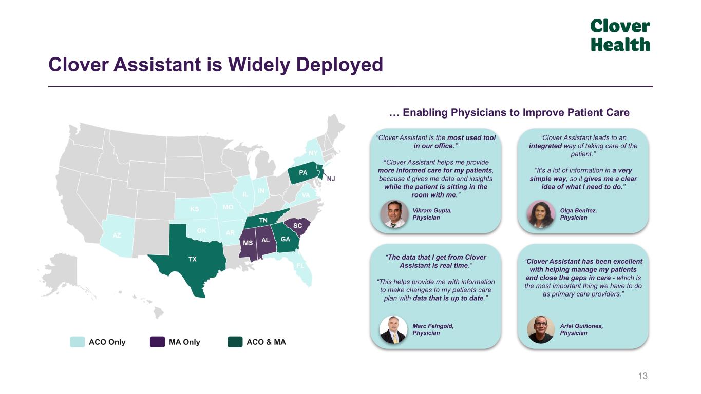 What is Clover Assistant? 12 Physician-centric design has simple onboarding, intuitive interfaces and is capable of integrating with many EHRs Powered by data and machine learning to help empower a wide, diverse network of PCPs CA offers a fulsome, longitudinal picture of the patient to improve care and outcomes CA is at the forefront of interoperability, aiming to improve care coordination Clover Assistant is a cloud-based software platform that empowers Medicare physicians to identify and manage chronic diseases earlier