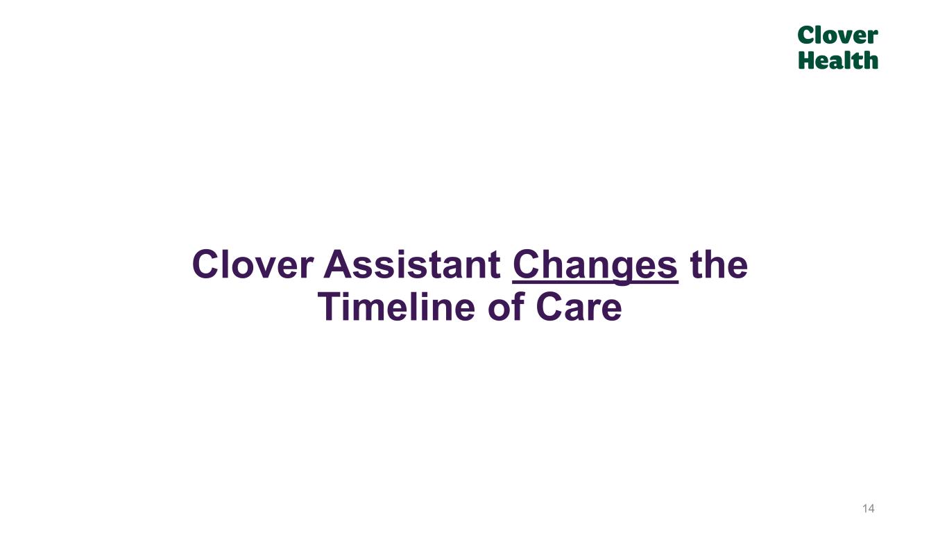 Clover Assistant is Widely Deployed 13 “Clover Assistant is the most used tool in our office.” “Clover Assistant helps me provide more informed care for my patients, because it gives me data and insights while the patient is sitting in the room with me.” Vikram Gupta, Physician “Clover Assistant leads to an integrated way of taking care of the patient.” “It's a lot of information in a very simple way, so it gives me a clear idea of what I need to do.” Olga Benitez, Physician “The data that I get from Clover Assistant is real time.” “This helps provide me with information to make changes to my patients care plan with data that is up to date.” Marc Feingold, Physician “Clover Assistant has been excellent with helping manage my patients and close the gaps in care - which is the most important thing we have to do as primary care providers.” Ariel Quiñones, Physician … Enabling Physicians to Improve Patient Care ACO Only MA Only ACO & MA