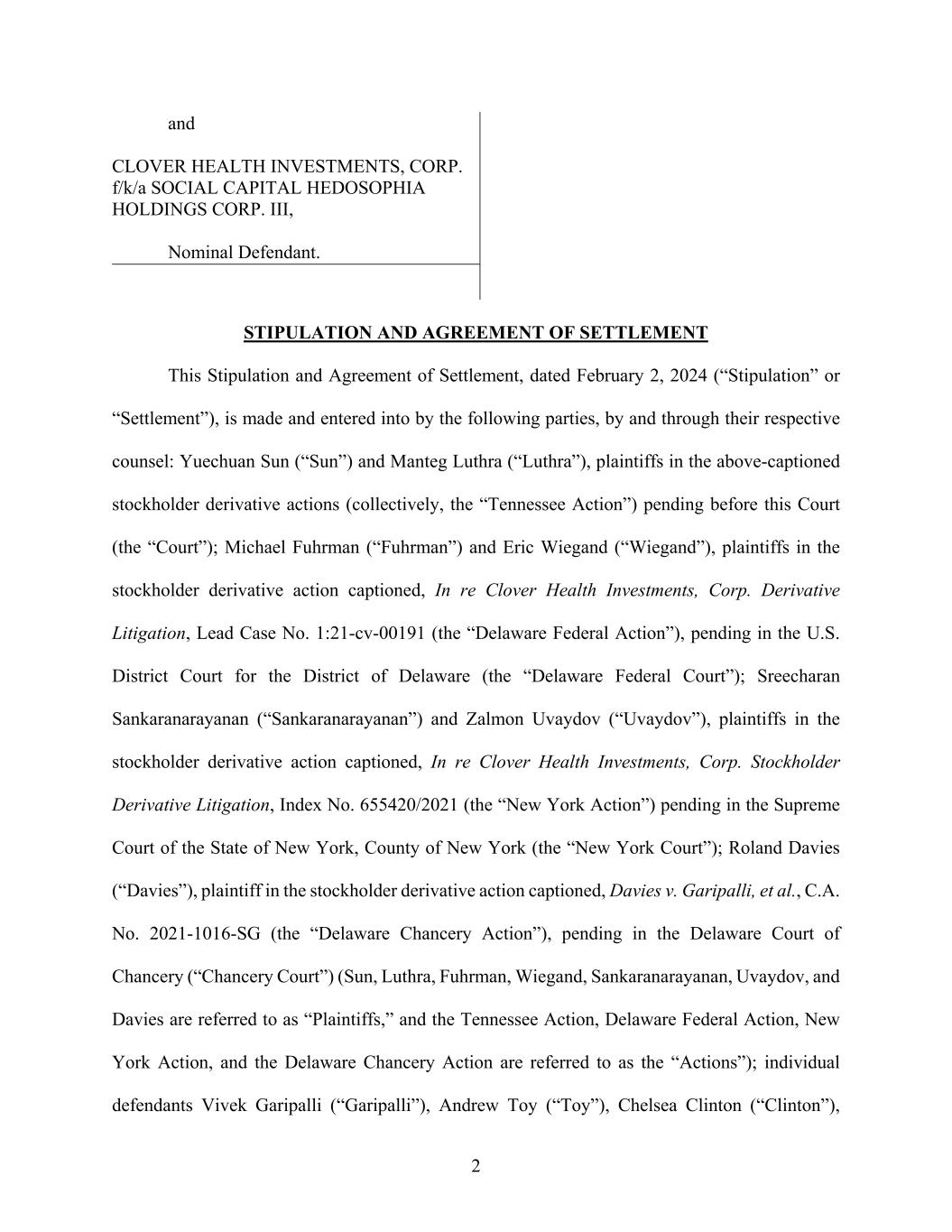 2 and CLOVER HEALTH INVESTMENTS, CORP. f/k/a SOCIAL CAPITAL HEDOSOPHIA HOLDINGS CORP. III, Nominal Defendant. STIPULATION AND AGREEMENT OF SETTLEMENT This Stipulation and Agreement of Settlement, dated February 2, 2024 (“Stipulation” or “Settlement”), is made and entered into by the following parties, by and through their respective counsel: Yuechuan Sun (“Sun”) and Manteg Luthra (“Luthra”), plaintiffs in the above-captioned stockholder derivative actions (collectively, the “Tennessee Action”) pending before this Court (the “Court”); Michael Fuhrman (“Fuhrman”) and Eric Wiegand (“Wiegand”), plaintiffs in the stockholder derivative action captioned, In re Clover Health Investments, Corp. Derivative Litigation, Lead Case No. 1:21-cv-00191 (the “Delaware Federal Action”), pending in the U.S. District Court for the District of Delaware (the “Delaware Federal Court”); Sreecharan Sankaranarayanan (“Sankaranarayanan”) and Zalmon Uvaydov (“Uvaydov”), plaintiffs in the stockholder derivative action captioned, In re Clover Health Investments, Corp. Stockholder Derivative Litigation, Index No. 655420/2021 (the “New York Action”) pending in the Supreme Court of the State of New York, County of New York (the “New York Court”); Roland Davies (“Davies”), plaintiff in the stockholder derivative action captioned, Davies v. Garipalli, et al., C.A. No. 2021-1016-SG (the “Delaware Chancery Action”), pending in the Delaware Court of Chancery (“Chancery Court”) (Sun, Luthra, Fuhrman, Wiegand, Sankaranarayanan, Uvaydov, and Davies are referred to as “Plaintiffs,” and the Tennessee Action, Delaware Federal Action, New York Action, and the Delaware Chancery Action are referred to as the “Actions”); individual defendants Vivek Garipalli (“Garipalli”), Andrew Toy (“Toy”), Chelsea Clinton (“Clinton”),