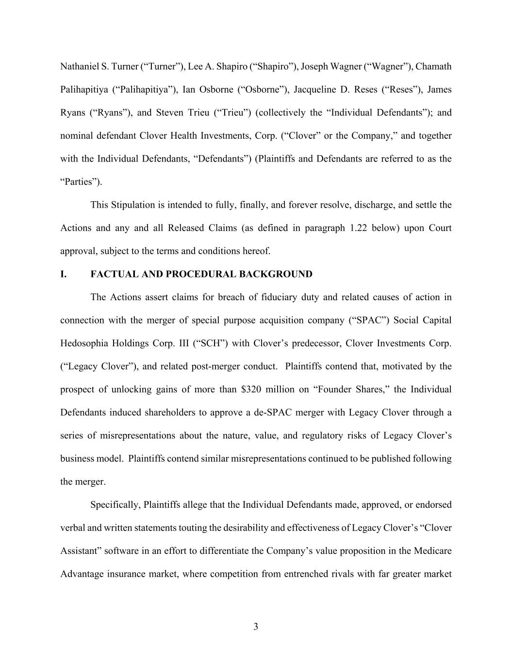 3 Nathaniel S. Turner (“Turner”), Lee A. Shapiro (“Shapiro”), Joseph Wagner (“Wagner”), Chamath Palihapitiya (“Palihapitiya”), Ian Osborne (“Osborne”), Jacqueline D. Reses (“Reses”), James Ryans (“Ryans”), and Steven Trieu (“Trieu”) (collectively the “Individual Defendants”); and nominal defendant Clover Health Investments, Corp. (“Clover” or the Company,” and together with the Individual Defendants, “Defendants”) (Plaintiffs and Defendants are referred to as the “Parties”). This Stipulation is intended to fully, finally, and forever resolve, discharge, and settle the Actions and any and all Released Claims (as defined in paragraph 1.22 below) upon Court approval, subject to the terms and conditions hereof. I. FACTUAL AND PROCEDURAL BACKGROUND The Actions assert claims for breach of fiduciary duty and related causes of action in connection with the merger of special purpose acquisition company (“SPAC”) Social Capital Hedosophia Holdings Corp. III (“SCH”) with Clover’s predecessor, Clover Investments Corp. (“Legacy Clover”), and related post-merger conduct. Plaintiffs contend that, motivated by the prospect of unlocking gains of more than $320 million on “Founder Shares,” the Individual Defendants induced shareholders to approve a de-SPAC merger with Legacy Clover through a series of misrepresentations about the nature, value, and regulatory risks of Legacy Clover’s business model. Plaintiffs contend similar misrepresentations continued to be published following the merger. Specifically, Plaintiffs allege that the Individual Defendants made, approved, or endorsed verbal and written statements touting the desirability and effectiveness of Legacy Clover’s “Clover Assistant” software in an effort to differentiate the Company’s value proposition in the Medicare Advantage insurance market, where competition from entrenched rivals with far greater market