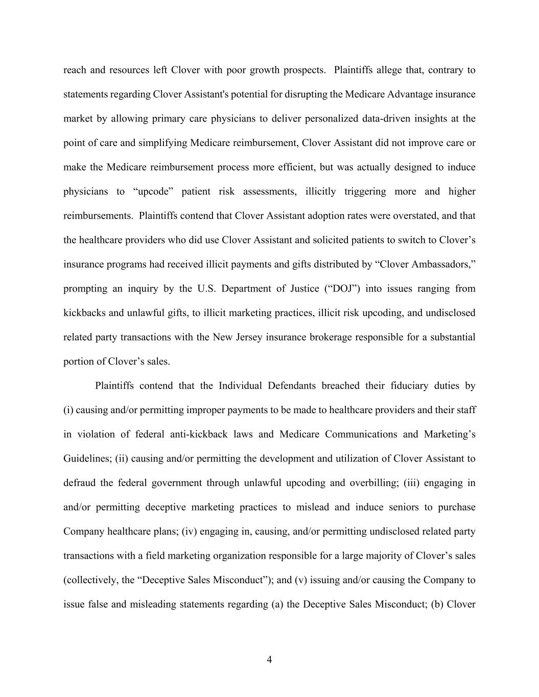 4 reach and resources left Clover with poor growth prospects. Plaintiffs allege that, contrary to statements regarding Clover Assistant's potential for disrupting the Medicare Advantage insurance market by allowing primary care physicians to deliver personalized data-driven insights at the point of care and simplifying Medicare reimbursement, Clover Assistant did not improve care or make the Medicare reimbursement process more efficient, but was actually designed to induce physicians to “upcode” patient risk assessments, illicitly triggering more and higher reimbursements. Plaintiffs contend that Clover Assistant adoption rates were overstated, and that the healthcare providers who did use Clover Assistant and solicited patients to switch to Clover’s insurance programs had received illicit payments and gifts distributed by “Clover Ambassadors,” prompting an inquiry by the U.S. Department of Justice (“DOJ”) into issues ranging from kickbacks and unlawful gifts, to illicit marketing practices, illicit risk upcoding, and undisclosed related party transactions with the New Jersey insurance brokerage responsible for a substantial portion of Clover’s sales. Plaintiffs contend that the Individual Defendants breached their fiduciary duties by (i) causing and/or permitting improper payments to be made to healthcare providers and their staff in violation of federal anti-kickback laws and Medicare Communications and Marketing’s Guidelines; (ii) causing and/or permitting the development and utilization of Clover Assistant to defraud the federal government through unlawful upcoding and overbilling; (iii) engaging in and/or permitting deceptive marketing practices to mislead and induce seniors to purchase Company healthcare plans; (iv) engaging in, causing, and/or permitting undisclosed related party transactions with a field marketing organization responsible for a large majority of Clover’s sales (collectively, the “Deceptive Sales Misconduct”); and (v) issuing and/or causing the Company to issue false and misleading statements regarding (a) the Deceptive Sales Misconduct; (b) Clover