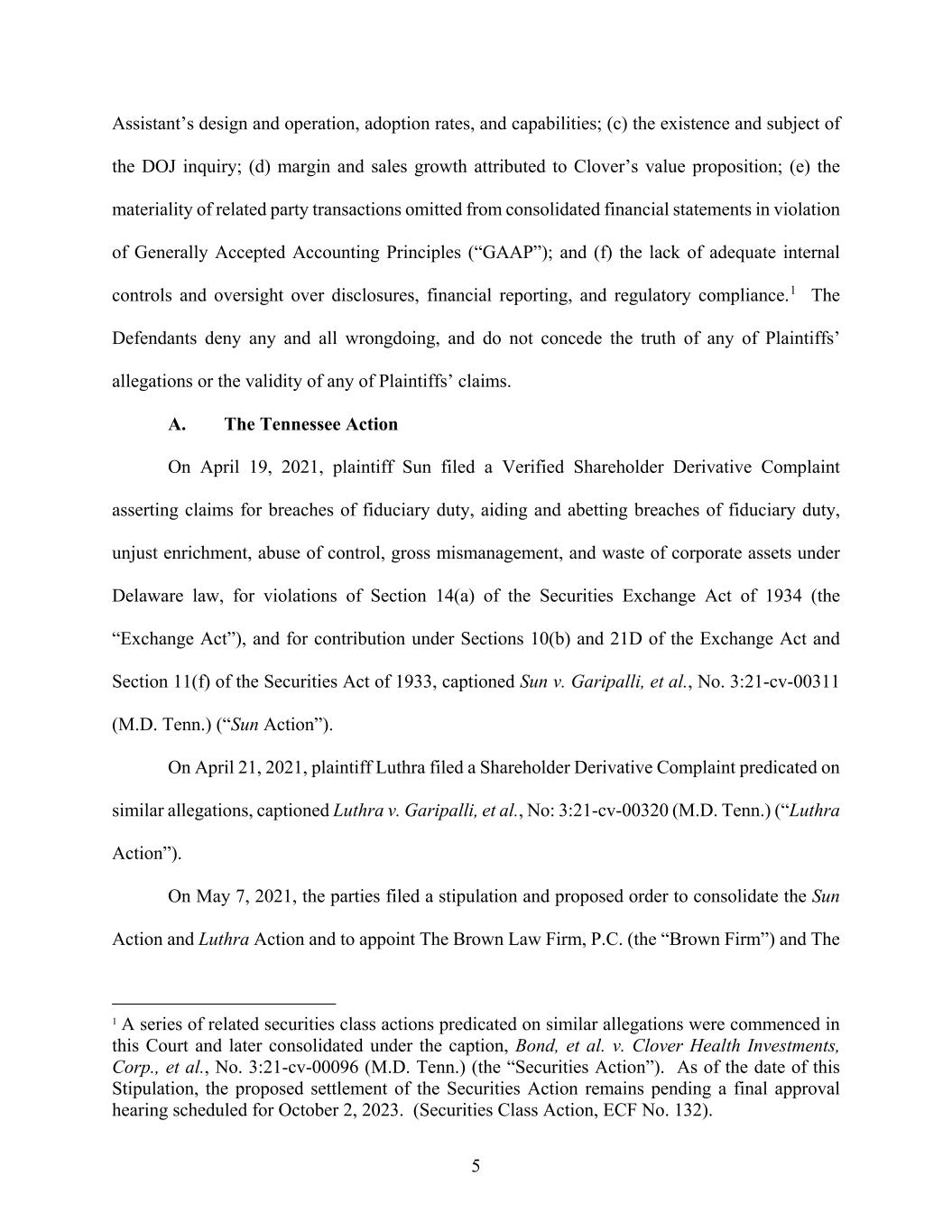 5 Assistant’s design and operation, adoption rates, and capabilities; (c) the existence and subject of the DOJ inquiry; (d) margin and sales growth attributed to Clover’s value proposition; (e) the materiality of related party transactions omitted from consolidated financial statements in violation of Generally Accepted Accounting Principles (“GAAP”); and (f) the lack of adequate internal controls and oversight over disclosures, financial reporting, and regulatory compliance.1 The Defendants deny any and all wrongdoing, and do not concede the truth of any of Plaintiffs’ allegations or the validity of any of Plaintiffs’ claims. A. The Tennessee Action On April 19, 2021, plaintiff Sun filed a Verified Shareholder Derivative Complaint asserting claims for breaches of fiduciary duty, aiding and abetting breaches of fiduciary duty, unjust enrichment, abuse of control, gross mismanagement, and waste of corporate assets under Delaware law, for violations of Section 14(a) of the Securities Exchange Act of 1934 (the “Exchange Act”), and for contribution under Sections 10(b) and 21D of the Exchange Act and Section 11(f) of the Securities Act of 1933, captioned Sun v. Garipalli, et al., No. 3:21-cv-00311 (M.D. Tenn.) (“Sun Action”). On April 21, 2021, plaintiff Luthra filed a Shareholder Derivative Complaint predicated on similar allegations, captioned Luthra v. Garipalli, et al., No: 3:21-cv-00320 (M.D. Tenn.) (“Luthra Action”). On May 7, 2021, the parties filed a stipulation and proposed order to consolidate the Sun Action and Luthra Action and to appoint The Brown Law Firm, P.C. (the “Brown Firm”) and The 1 A series of related securities class actions predicated on similar allegations were commenced in this Court and later consolidated under the caption, Bond, et al. v. Clover Health Investments, Corp., et al., No. 3:21-cv-00096 (M.D. Tenn.) (the “Securities Action”). As of the date of this Stipulation, the proposed settlement of the Securities Action remains pending a final approval hearing scheduled for October 2, 2023. (Securities Class Action, ECF No. 132).