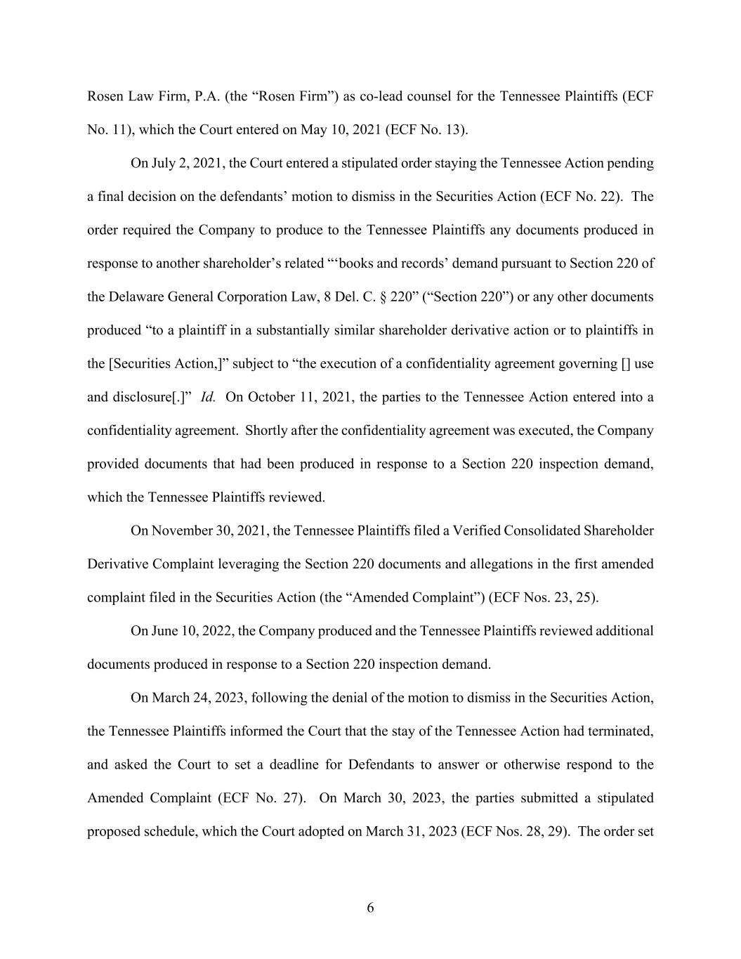 6 Rosen Law Firm, P.A. (the “Rosen Firm”) as co-lead counsel for the Tennessee Plaintiffs (ECF No. 11), which the Court entered on May 10, 2021 (ECF No. 13). On July 2, 2021, the Court entered a stipulated order staying the Tennessee Action pending a final decision on the defendants’ motion to dismiss in the Securities Action (ECF No. 22). The order required the Company to produce to the Tennessee Plaintiffs any documents produced in response to another shareholder’s related “‘books and records’ demand pursuant to Section 220 of the Delaware General Corporation Law, 8 Del. C. § 220” (“Section 220”) or any other documents produced “to a plaintiff in a substantially similar shareholder derivative action or to plaintiffs in the [Securities Action,]” subject to “the execution of a confidentiality agreement governing [] use and disclosure[.]” Id. On October 11, 2021, the parties to the Tennessee Action entered into a confidentiality agreement. Shortly after the confidentiality agreement was executed, the Company provided documents that had been produced in response to a Section 220 inspection demand, which the Tennessee Plaintiffs reviewed. On November 30, 2021, the Tennessee Plaintiffs filed a Verified Consolidated Shareholder Derivative Complaint leveraging the Section 220 documents and allegations in the first amended complaint filed in the Securities Action (the “Amended Complaint”) (ECF Nos. 23, 25). On June 10, 2022, the Company produced and the Tennessee Plaintiffs reviewed additional documents produced in response to a Section 220 inspection demand. On March 24, 2023, following the denial of the motion to dismiss in the Securities Action, the Tennessee Plaintiffs informed the Court that the stay of the Tennessee Action had terminated, and asked the Court to set a deadline for Defendants to answer or otherwise respond to the Amended Complaint (ECF No. 27). On March 30, 2023, the parties submitted a stipulated proposed schedule, which the Court adopted on March 31, 2023 (ECF Nos. 28, 29). The order set