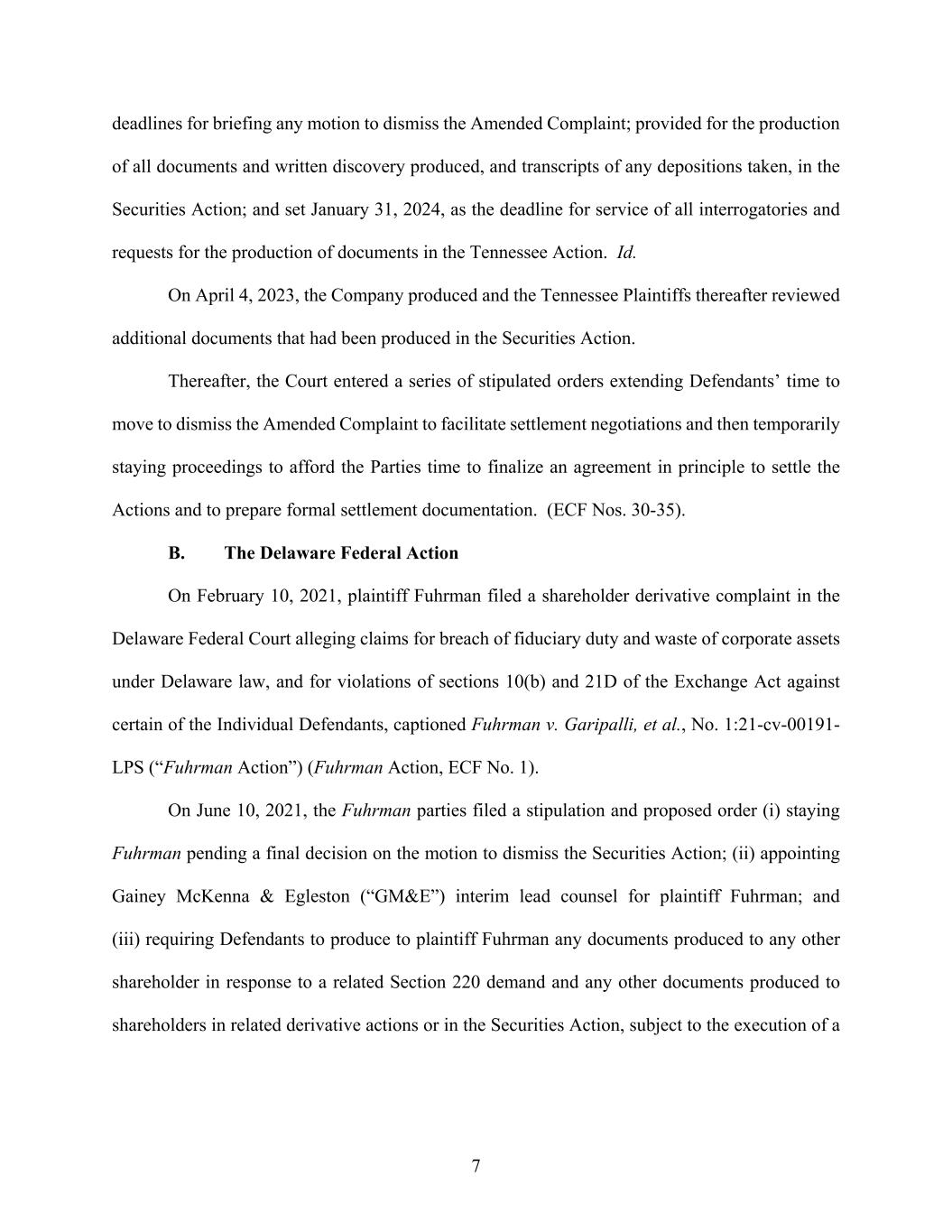 7 deadlines for briefing any motion to dismiss the Amended Complaint; provided for the production of all documents and written discovery produced, and transcripts of any depositions taken, in the Securities Action; and set January 31, 2024, as the deadline for service of all interrogatories and requests for the production of documents in the Tennessee Action. Id. On April 4, 2023, the Company produced and the Tennessee Plaintiffs thereafter reviewed additional documents that had been produced in the Securities Action. Thereafter, the Court entered a series of stipulated orders extending Defendants’ time to move to dismiss the Amended Complaint to facilitate settlement negotiations and then temporarily staying proceedings to afford the Parties time to finalize an agreement in principle to settle the Actions and to prepare formal settlement documentation. (ECF Nos. 30-35). B. The Delaware Federal Action On February 10, 2021, plaintiff Fuhrman filed a shareholder derivative complaint in the Delaware Federal Court alleging claims for breach of fiduciary duty and waste of corporate assets under Delaware law, and for violations of sections 10(b) and 21D of the Exchange Act against certain of the Individual Defendants, captioned Fuhrman v. Garipalli, et al., No. 1:21-cv-00191- LPS (“Fuhrman Action”) (Fuhrman Action, ECF No. 1). On June 10, 2021, the Fuhrman parties filed a stipulation and proposed order (i) staying Fuhrman pending a final decision on the motion to dismiss the Securities Action; (ii) appointing Gainey McKenna & Egleston (“GM&E”) interim lead counsel for plaintiff Fuhrman; and (iii) requiring Defendants to produce to plaintiff Fuhrman any documents produced to any other shareholder in response to a related Section 220 demand and any other documents produced to shareholders in related derivative actions or in the Securities Action, subject to the execution of a