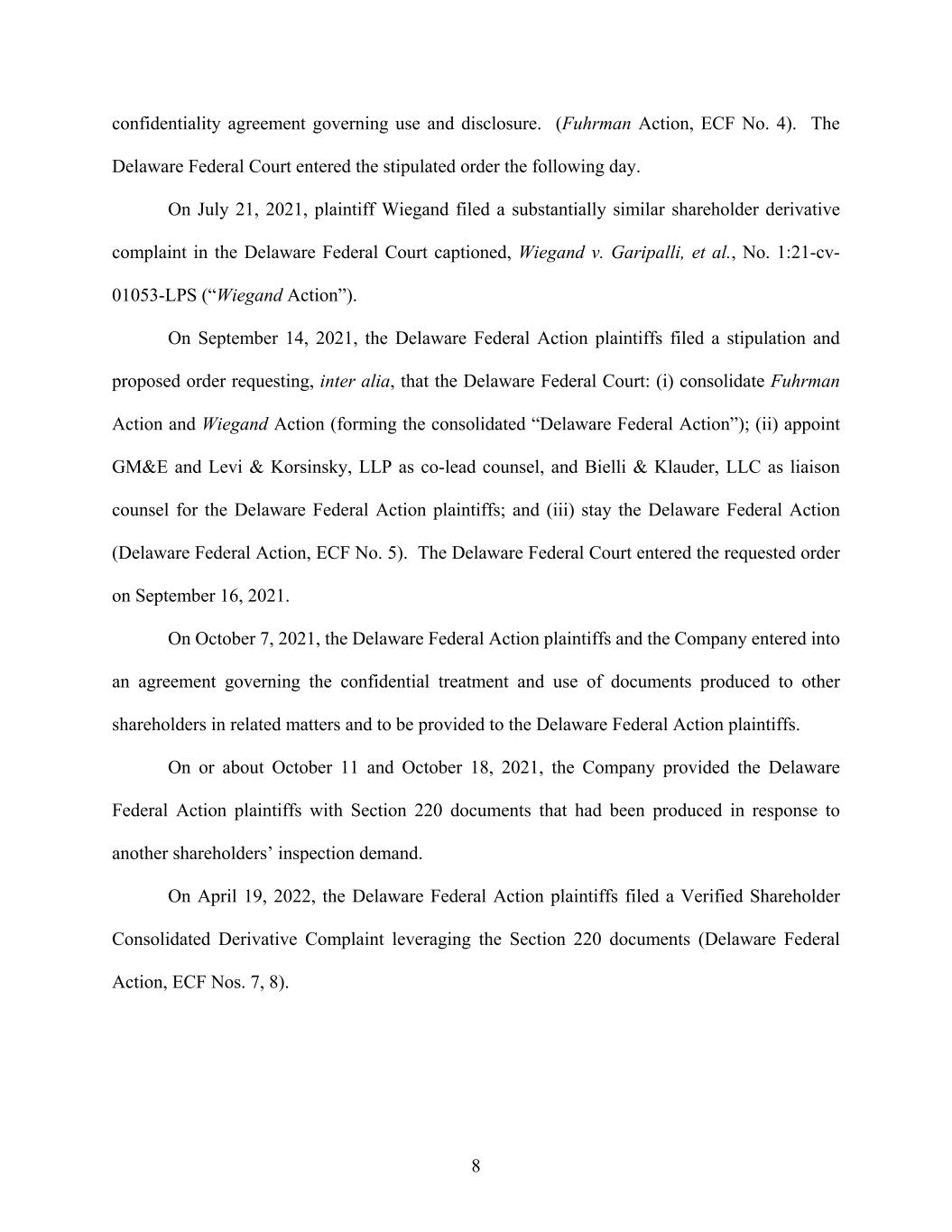 6 against certain of the Individual Defendants, captioned Fuhrman v. Garipalli, et al., No. 1:21-cv- 00191-LPS (“Fuhrman Action”) (Fuhrman Action, ECF No. 1). 15. On June 10, 2021, the Fuhrman parties filed a stipulation and proposed order (i) staying Fuhrman pending a final decision on the motion to dismiss the Securities Action; (ii) appointing Gainey McKenna & Egleston (“GM&E”) interim lead counsel for plaintiff Fuhrman; and (iii) requiring Defendants to produce to plaintiff Fuhrman any documents produced to any other shareholder in response to a related Section 220 demand and any other documents produced to shareholders in related derivative actions or in the Securities Action, subject to the execution of a confidentiality agreement governing use and disclosure. (Fuhrman Action, ECF No. 4). The Delaware Federal Court entered the stipulated order the following day. 16. On July 21, 2021, plaintiff Wiegand filed a substantially similar shareholder derivative complaint in the Delaware Federal Court captioned, Wiegand v. Garipalli, et al., No. 1:21-cv-01053-LPS (“Wiegand Action”). 17. On September 14, 2021, the Delaware Federal Action plaintiffs filed a stipulation and proposed order requesting, inter alia, that the Delaware Federal Court: (i) consolidate Fuhrman Action and Wiegand Action (forming the consolidated “Delaware Federal Action”); (ii) appoint GM&E and Levi & Korsinsky, LLP as co-lead counsel, and Bielli & Klauder, LLC as liaison counsel for the Delaware Federal Action plaintiffs; and (iii) stay the Delaware Federal Action (Delaware Federal Action, ECF No. 5). The Delaware Federal Court entered the requested order on September 16, 2021. 18. On October 7, 2021, the Delaware Federal Action plaintiffs and the Company entered into an agreement governing the confidential treatment and use of documents produced to other shareholders in related matters and to be provided to the Delaware Federal Action plaintiffs. 19. On or about October 11 and October 18, 2021, the Company provided the Delaware Federal Action plaintiffs with Section 220 documents that had been produced in response to another shareholders’ inspection demand. 20. On April 19, 2022, the Delaware Federal Action plaintiffs filed a Verified Shareholder Consolidated Derivative Complaint leveraging the Section 220 documents (Delaware Federal Action, ECF Nos. 7, 8). 21. On April 29, 2022, the parties filed a stipulation and proposed order extending the temporary stay to July 28, 2022, which the Court granted (Delaware Federal Action, ECF Nos. 9, 10). 22. On June 10, 2022, the Company produced additional Section 220 documents, which the Delaware Federal Action plaintiffs reviewed and evaluated. 23. On August 4, 2022, the parties filed a stipulation and proposed order extending the temporary stay to facilitate continued settlement negotiations, following a global mediation session attended by parties to all of the related derivative Actions (Delaware Federal Action, ECF No. 12). The Court entered an order extending the stay of the Delaware Federal Action to November 2, 2022 (Delaware Federal Action, ECF No. 13).