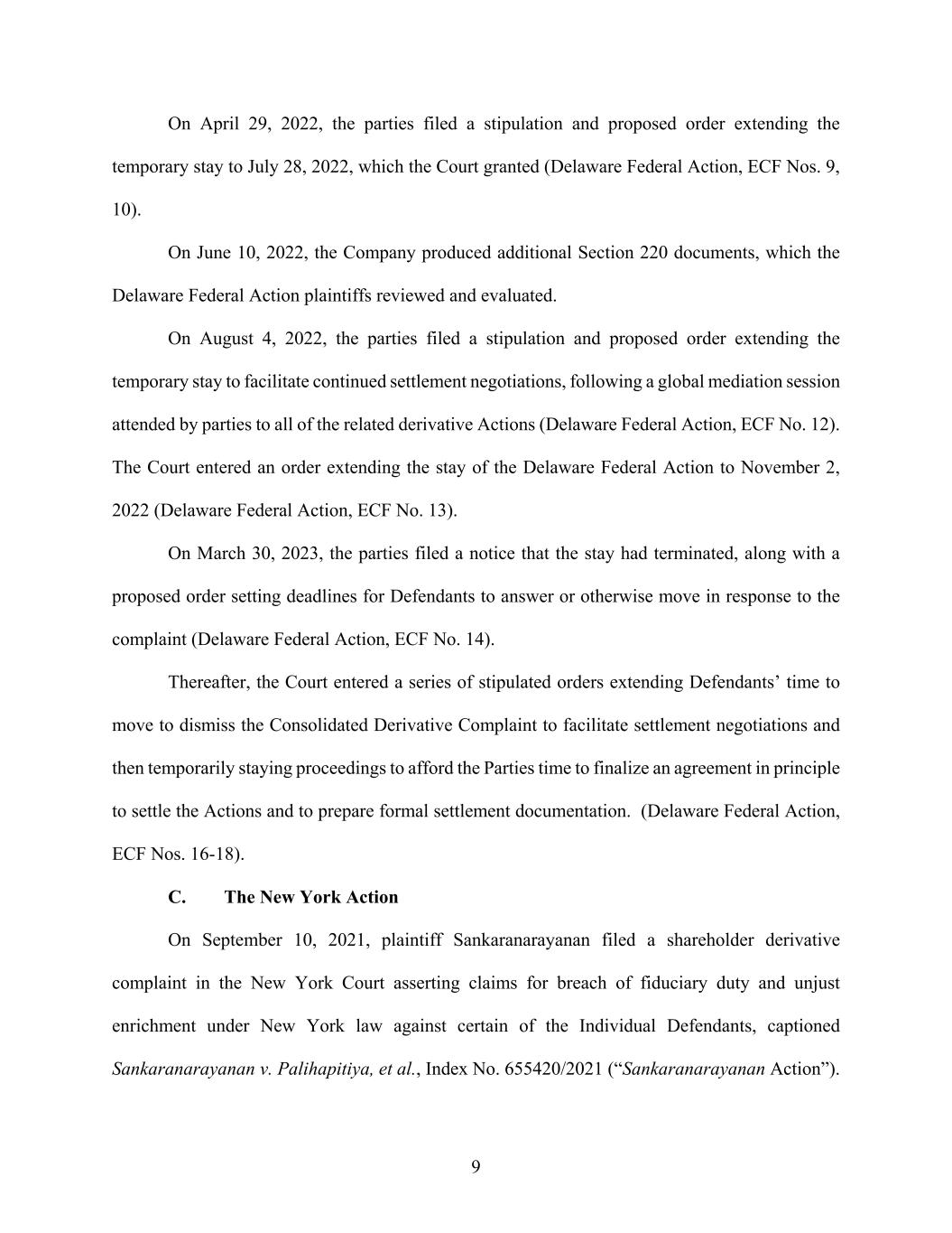 9 On April 29, 2022, the parties filed a stipulation and proposed order extending the temporary stay to July 28, 2022, which the Court granted (Delaware Federal Action, ECF Nos. 9, 10). On June 10, 2022, the Company produced additional Section 220 documents, which the Delaware Federal Action plaintiffs reviewed and evaluated. On August 4, 2022, the parties filed a stipulation and proposed order extending the temporary stay to facilitate continued settlement negotiations, following a global mediation session attended by parties to all of the related derivative Actions (Delaware Federal Action, ECF No. 12). The Court entered an order extending the stay of the Delaware Federal Action to November 2, 2022 (Delaware Federal Action, ECF No. 13). On March 30, 2023, the parties filed a notice that the stay had terminated, along with a proposed order setting deadlines for Defendants to answer or otherwise move in response to the complaint (Delaware Federal Action, ECF No. 14). Thereafter, the Court entered a series of stipulated orders extending Defendants’ time to move to dismiss the Consolidated Derivative Complaint to facilitate settlement negotiations and then temporarily staying proceedings to afford the Parties time to finalize an agreement in principle to settle the Actions and to prepare formal settlement documentation. (Delaware Federal Action, ECF Nos. 16-18). C. The New York Action On September 10, 2021, plaintiff Sankaranarayanan filed a shareholder derivative complaint in the New York Court asserting claims for breach of fiduciary duty and unjust enrichment under New York law against certain of the Individual Defendants, captioned Sankaranarayanan v. Palihapitiya, et al., Index No. 655420/2021 (“Sankaranarayanan Action”).