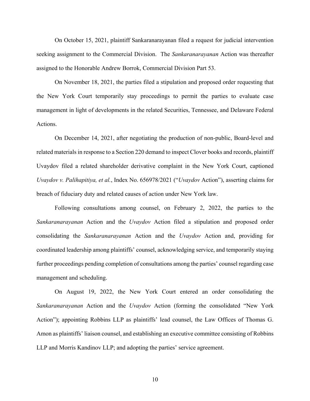 10 On October 15, 2021, plaintiff Sankaranarayanan filed a request for judicial intervention seeking assignment to the Commercial Division. The Sankaranarayanan Action was thereafter assigned to the Honorable Andrew Borrok, Commercial Division Part 53. On November 18, 2021, the parties filed a stipulation and proposed order requesting that the New York Court temporarily stay proceedings to permit the parties to evaluate case management in light of developments in the related Securities, Tennessee, and Delaware Federal Actions. On December 14, 2021, after negotiating the production of non-public, Board-level and related materials in response to a Section 220 demand to inspect Clover books and records, plaintiff Uvaydov filed a related shareholder derivative complaint in the New York Court, captioned Uvaydov v. Palihapitiya, et al., Index No. 656978/2021 (“Uvaydov Action”), asserting claims for breach of fiduciary duty and related causes of action under New York law. Following consultations among counsel, on February 2, 2022, the parties to the Sankaranarayanan Action and the Uvaydov Action filed a stipulation and proposed order consolidating the Sankaranarayanan Action and the Uvaydov Action and, providing for coordinated leadership among plaintiffs’ counsel, acknowledging service, and temporarily staying further proceedings pending completion of consultations among the parties’ counsel regarding case management and scheduling. On August 19, 2022, the New York Court entered an order consolidating the Sankaranarayanan Action and the Uvaydov Action (forming the consolidated “New York Action”); appointing Robbins LLP as plaintiffs’ lead counsel, the Law Offices of Thomas G. Amon as plaintiffs’ liaison counsel, and establishing an executive committee consisting of Robbins LLP and Morris Kandinov LLP; and adopting the parties’ service agreement.