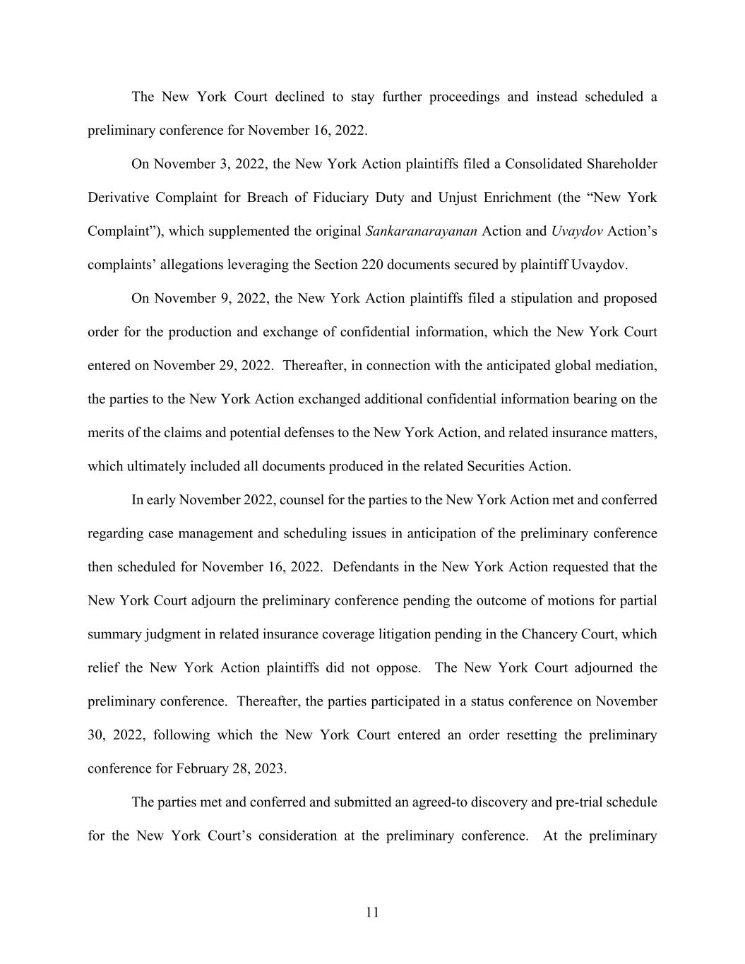 11 The New York Court declined to stay further proceedings and instead scheduled a preliminary conference for November 16, 2022. On November 3, 2022, the New York Action plaintiffs filed a Consolidated Shareholder Derivative Complaint for Breach of Fiduciary Duty and Unjust Enrichment (the “New York Complaint”), which supplemented the original Sankaranarayanan Action and Uvaydov Action’s complaints’ allegations leveraging the Section 220 documents secured by plaintiff Uvaydov. On November 9, 2022, the New York Action plaintiffs filed a stipulation and proposed order for the production and exchange of confidential information, which the New York Court entered on November 29, 2022. Thereafter, in connection with the anticipated global mediation, the parties to the New York Action exchanged additional confidential information bearing on the merits of the claims and potential defenses to the New York Action, and related insurance matters, which ultimately included all documents produced in the related Securities Action. In early November 2022, counsel for the parties to the New York Action met and conferred regarding case management and scheduling issues in anticipation of the preliminary conference then scheduled for November 16, 2022. Defendants in the New York Action requested that the New York Court adjourn the preliminary conference pending the outcome of motions for partial summary judgment in related insurance coverage litigation pending in the Chancery Court, which relief the New York Action plaintiffs did not oppose. The New York Court adjourned the preliminary conference. Thereafter, the parties participated in a status conference on November 30, 2022, following which the New York Court entered an order resetting the preliminary conference for February 28, 2023. The parties met and conferred and submitted an agreed-to discovery and pre-trial schedule for the New York Court’s consideration at the preliminary conference. At the preliminary