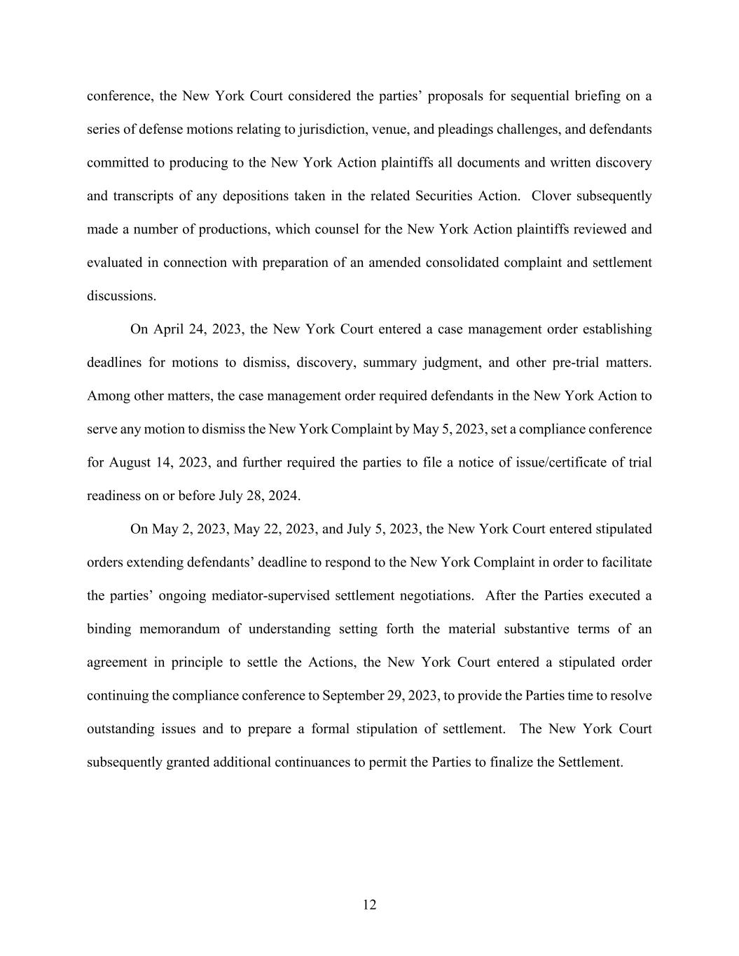 12 conference, the New York Court considered the parties’ proposals for sequential briefing on a series of defense motions relating to jurisdiction, venue, and pleadings challenges, and defendants committed to producing to the New York Action plaintiffs all documents and written discovery and transcripts of any depositions taken in the related Securities Action. Clover subsequently made a number of productions, which counsel for the New York Action plaintiffs reviewed and evaluated in connection with preparation of an amended consolidated complaint and settlement discussions. On April 24, 2023, the New York Court entered a case management order establishing deadlines for motions to dismiss, discovery, summary judgment, and other pre-trial matters. Among other matters, the case management order required defendants in the New York Action to serve any motion to dismiss the New York Complaint by May 5, 2023, set a compliance conference for August 14, 2023, and further required the parties to file a notice of issue/certificate of trial readiness on or before July 28, 2024. On May 2, 2023, May 22, 2023, and July 5, 2023, the New York Court entered stipulated orders extending defendants’ deadline to respond to the New York Complaint in order to facilitate the parties’ ongoing mediator-supervised settlement negotiations. After the Parties executed a binding memorandum of understanding setting forth the material substantive terms of an agreement in principle to settle the Actions, the New York Court entered a stipulated order continuing the compliance conference to September 29, 2023, to provide the Parties time to resolve outstanding issues and to prepare a formal stipulation of settlement. The New York Court subsequently granted additional continuances to permit the Parties to finalize the Settlement.