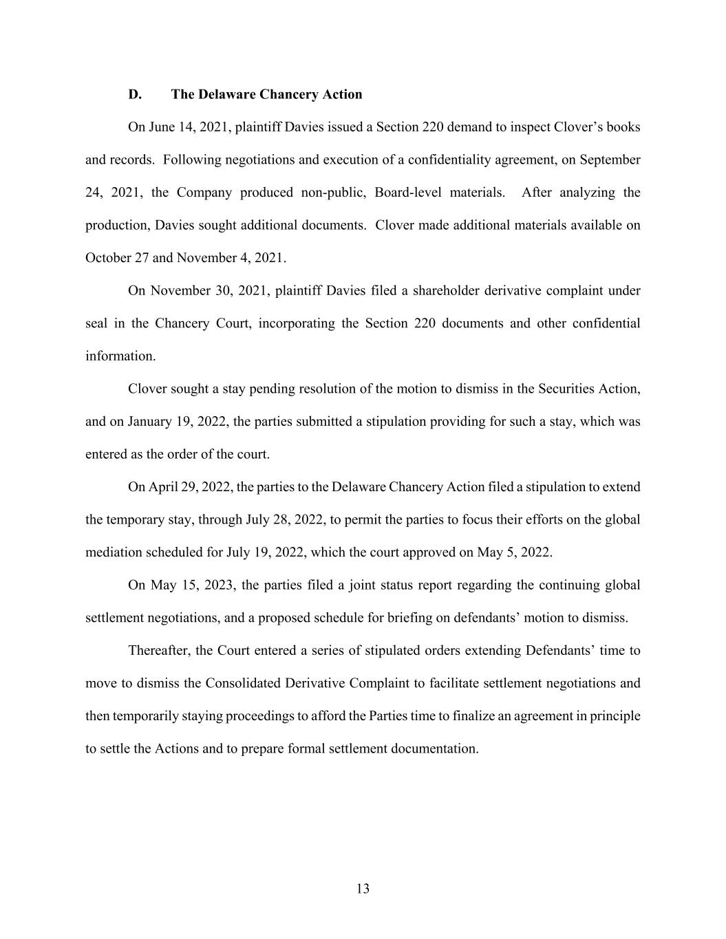 13 D. The Delaware Chancery Action On June 14, 2021, plaintiff Davies issued a Section 220 demand to inspect Clover’s books and records. Following negotiations and execution of a confidentiality agreement, on September 24, 2021, the Company produced non-public, Board-level materials. After analyzing the production, Davies sought additional documents. Clover made additional materials available on October 27 and November 4, 2021. On November 30, 2021, plaintiff Davies filed a shareholder derivative complaint under seal in the Chancery Court, incorporating the Section 220 documents and other confidential information. Clover sought a stay pending resolution of the motion to dismiss in the Securities Action, and on January 19, 2022, the parties submitted a stipulation providing for such a stay, which was entered as the order of the court. On April 29, 2022, the parties to the Delaware Chancery Action filed a stipulation to extend the temporary stay, through July 28, 2022, to permit the parties to focus their efforts on the global mediation scheduled for July 19, 2022, which the court approved on May 5, 2022. On May 15, 2023, the parties filed a joint status report regarding the continuing global settlement negotiations, and a proposed schedule for briefing on defendants’ motion to dismiss. Thereafter, the Court entered a series of stipulated orders extending Defendants’ time to move to dismiss the Consolidated Derivative Complaint to facilitate settlement negotiations and then temporarily staying proceedings to afford the Parties time to finalize an agreement in principle to settle the Actions and to prepare formal settlement documentation.