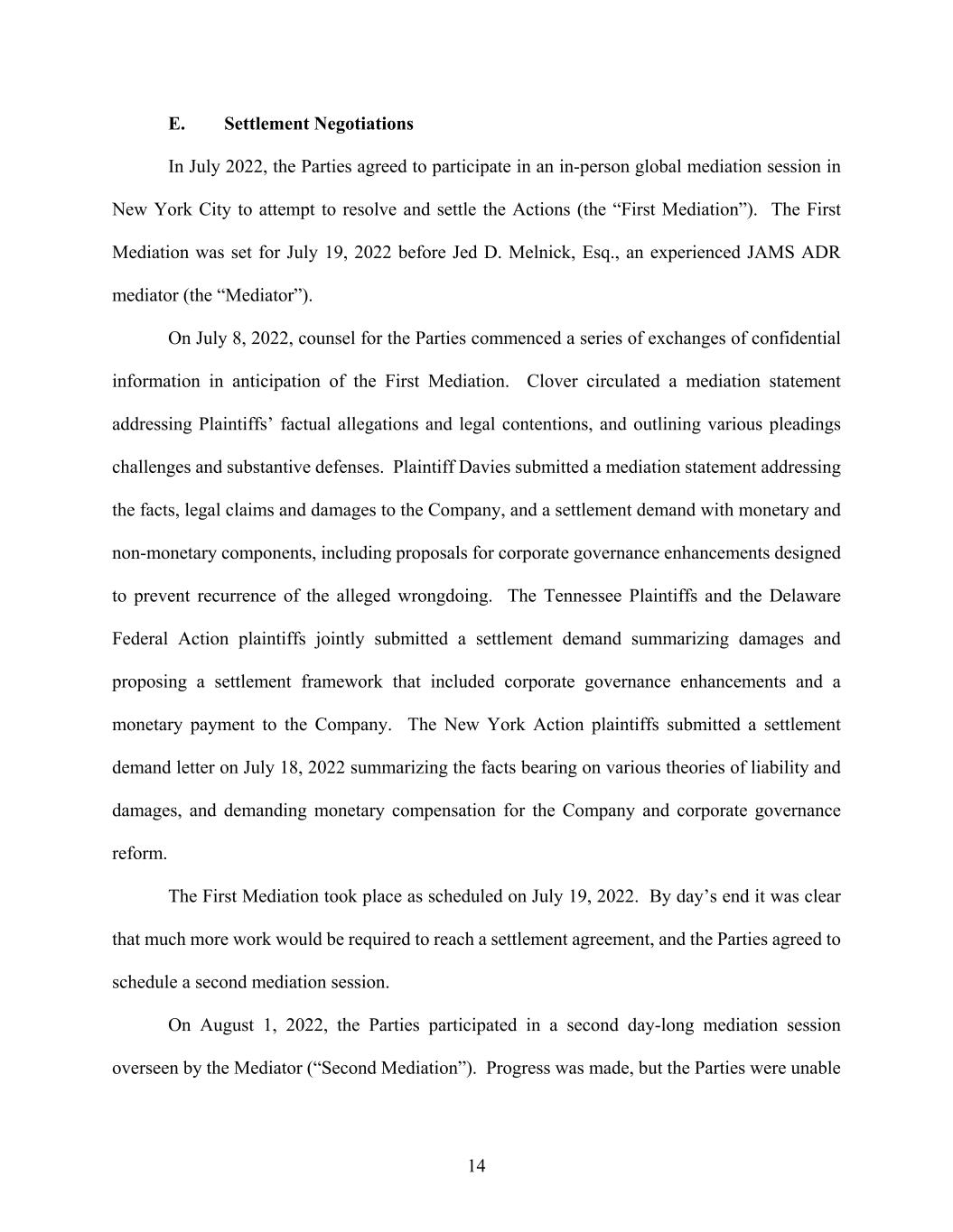 14 E. Settlement Negotiations In July 2022, the Parties agreed to participate in an in-person global mediation session in New York City to attempt to resolve and settle the Actions (the “First Mediation”). The First Mediation was set for July 19, 2022 before Jed D. Melnick, Esq., an experienced JAMS ADR mediator (the “Mediator”). On July 8, 2022, counsel for the Parties commenced a series of exchanges of confidential information in anticipation of the First Mediation. Clover circulated a mediation statement addressing Plaintiffs’ factual allegations and legal contentions, and outlining various pleadings challenges and substantive defenses. Plaintiff Davies submitted a mediation statement addressing the facts, legal claims and damages to the Company, and a settlement demand with monetary and non-monetary components, including proposals for corporate governance enhancements designed to prevent recurrence of the alleged wrongdoing. The Tennessee Plaintiffs and the Delaware Federal Action plaintiffs jointly submitted a settlement demand summarizing damages and proposing a settlement framework that included corporate governance enhancements and a monetary payment to the Company. The New York Action plaintiffs submitted a settlement demand letter on July 18, 2022 summarizing the facts bearing on various theories of liability and damages, and demanding monetary compensation for the Company and corporate governance reform. The First Mediation took place as scheduled on July 19, 2022. By day’s end it was clear that much more work would be required to reach a settlement agreement, and the Parties agreed to schedule a second mediation session. On August 1, 2022, the Parties participated in a second day-long mediation session overseen by the Mediator (“Second Mediation”). Progress was made, but the Parties were unable