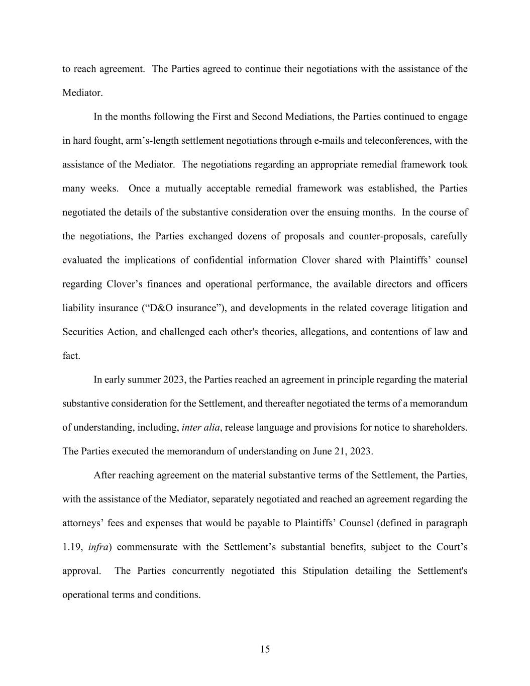 15 to reach agreement. The Parties agreed to continue their negotiations with the assistance of the Mediator. In the months following the First and Second Mediations, the Parties continued to engage in hard fought, arm’s-length settlement negotiations through e-mails and teleconferences, with the assistance of the Mediator. The negotiations regarding an appropriate remedial framework took many weeks. Once a mutually acceptable remedial framework was established, the Parties negotiated the details of the substantive consideration over the ensuing months. In the course of the negotiations, the Parties exchanged dozens of proposals and counter-proposals, carefully evaluated the implications of confidential information Clover shared with Plaintiffs’ counsel regarding Clover’s finances and operational performance, the available directors and officers liability insurance (“D&O insurance”), and developments in the related coverage litigation and Securities Action, and challenged each other's theories, allegations, and contentions of law and fact. In early summer 2023, the Parties reached an agreement in principle regarding the material substantive consideration for the Settlement, and thereafter negotiated the terms of a memorandum of understanding, including, inter alia, release language and provisions for notice to shareholders. The Parties executed the memorandum of understanding on June 21, 2023. After reaching agreement on the material substantive terms of the Settlement, the Parties, with the assistance of the Mediator, separately negotiated and reached an agreement regarding the attorneys’ fees and expenses that would be payable to Plaintiffs’ Counsel (defined in paragraph 1.19, infra) commensurate with the Settlement’s substantial benefits, subject to the Court’s approval. The Parties concurrently negotiated this Stipulation detailing the Settlement's operational terms and conditions.