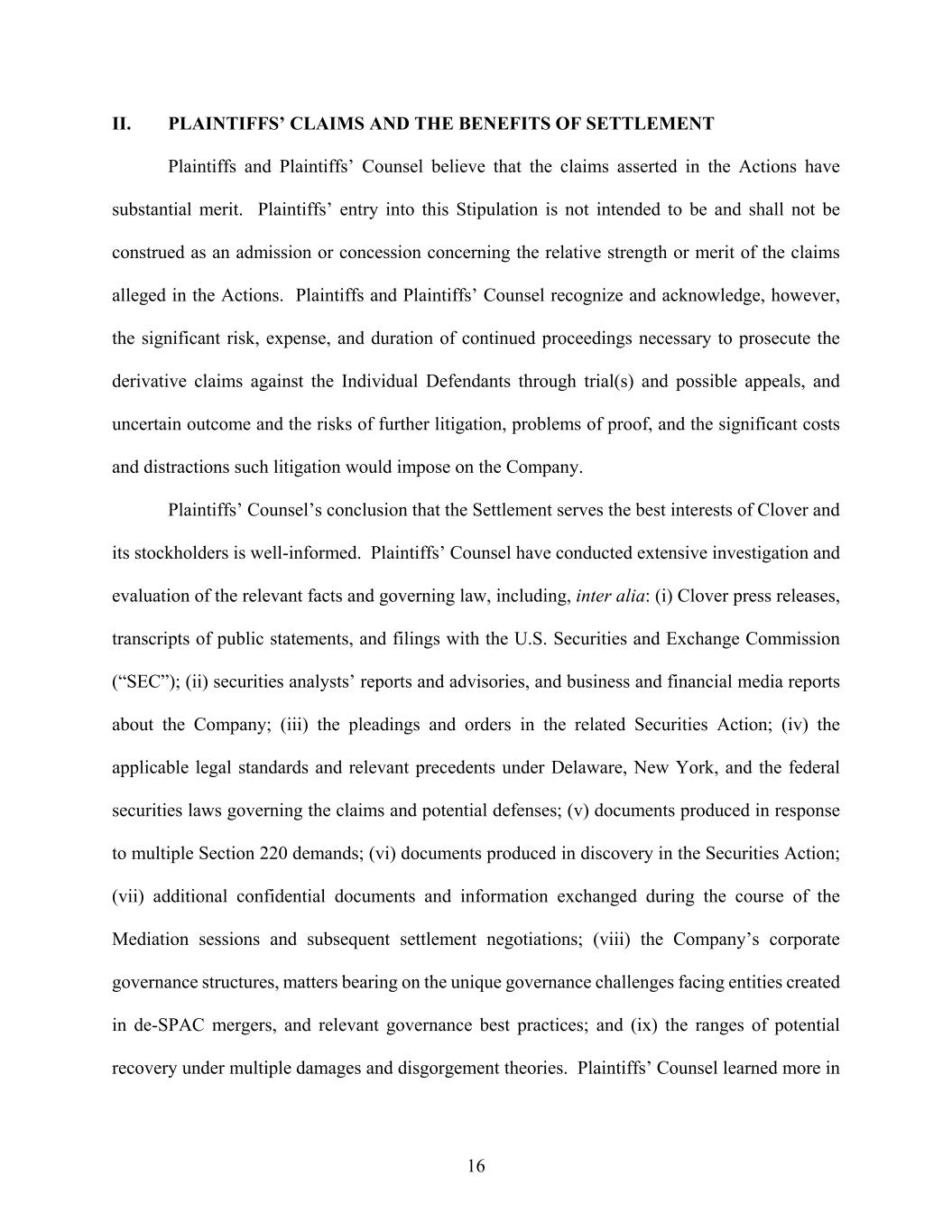 16 II. PLAINTIFFS’ CLAIMS AND THE BENEFITS OF SETTLEMENT Plaintiffs and Plaintiffs’ Counsel believe that the claims asserted in the Actions have substantial merit. Plaintiffs’ entry into this Stipulation is not intended to be and shall not be construed as an admission or concession concerning the relative strength or merit of the claims alleged in the Actions. Plaintiffs and Plaintiffs’ Counsel recognize and acknowledge, however, the significant risk, expense, and duration of continued proceedings necessary to prosecute the derivative claims against the Individual Defendants through trial(s) and possible appeals, and uncertain outcome and the risks of further litigation, problems of proof, and the significant costs and distractions such litigation would impose on the Company. Plaintiffs’ Counsel’s conclusion that the Settlement serves the best interests of Clover and its stockholders is well-informed. Plaintiffs’ Counsel have conducted extensive investigation and evaluation of the relevant facts and governing law, including, inter alia: (i) Clover press releases, transcripts of public statements, and filings with the U.S. Securities and Exchange Commission (“SEC”); (ii) securities analysts’ reports and advisories, and business and financial media reports about the Company; (iii) the pleadings and orders in the related Securities Action; (iv) the applicable legal standards and relevant precedents under Delaware, New York, and the federal securities laws governing the claims and potential defenses; (v) documents produced in response to multiple Section 220 demands; (vi) documents produced in discovery in the Securities Action; (vii) additional confidential documents and information exchanged during the course of the Mediation sessions and subsequent settlement negotiations; (viii) the Company’s corporate governance structures, matters bearing on the unique governance challenges facing entities created in de-SPAC mergers, and relevant governance best practices; and (ix) the ranges of potential recovery under multiple damages and disgorgement theories. Plaintiffs’ Counsel learned more in