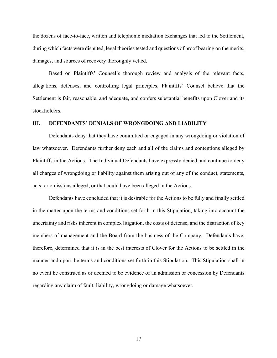 17 the dozens of face-to-face, written and telephonic mediation exchanges that led to the Settlement, during which facts were disputed, legal theories tested and questions of proof bearing on the merits, damages, and sources of recovery thoroughly vetted. Based on Plaintiffs’ Counsel’s thorough review and analysis of the relevant facts, allegations, defenses, and controlling legal principles, Plaintiffs’ Counsel believe that the Settlement is fair, reasonable, and adequate, and confers substantial benefits upon Clover and its stockholders. III. DEFENDANTS’ DENIALS OF WRONGDOING AND LIABILITY Defendants deny that they have committed or engaged in any wrongdoing or violation of law whatsoever. Defendants further deny each and all of the claims and contentions alleged by Plaintiffs in the Actions. The Individual Defendants have expressly denied and continue to deny all charges of wrongdoing or liability against them arising out of any of the conduct, statements, acts, or omissions alleged, or that could have been alleged in the Actions. Defendants have concluded that it is desirable for the Actions to be fully and finally settled in the matter upon the terms and conditions set forth in this Stipulation, taking into account the uncertainty and risks inherent in complex litigation, the costs of defense, and the distraction of key members of management and the Board from the business of the Company. Defendants have, therefore, determined that it is in the best interests of Clover for the Actions to be settled in the manner and upon the terms and conditions set forth in this Stipulation. This Stipulation shall in no event be construed as or deemed to be evidence of an admission or concession by Defendants regarding any claim of fault, liability, wrongdoing or damage whatsoever.