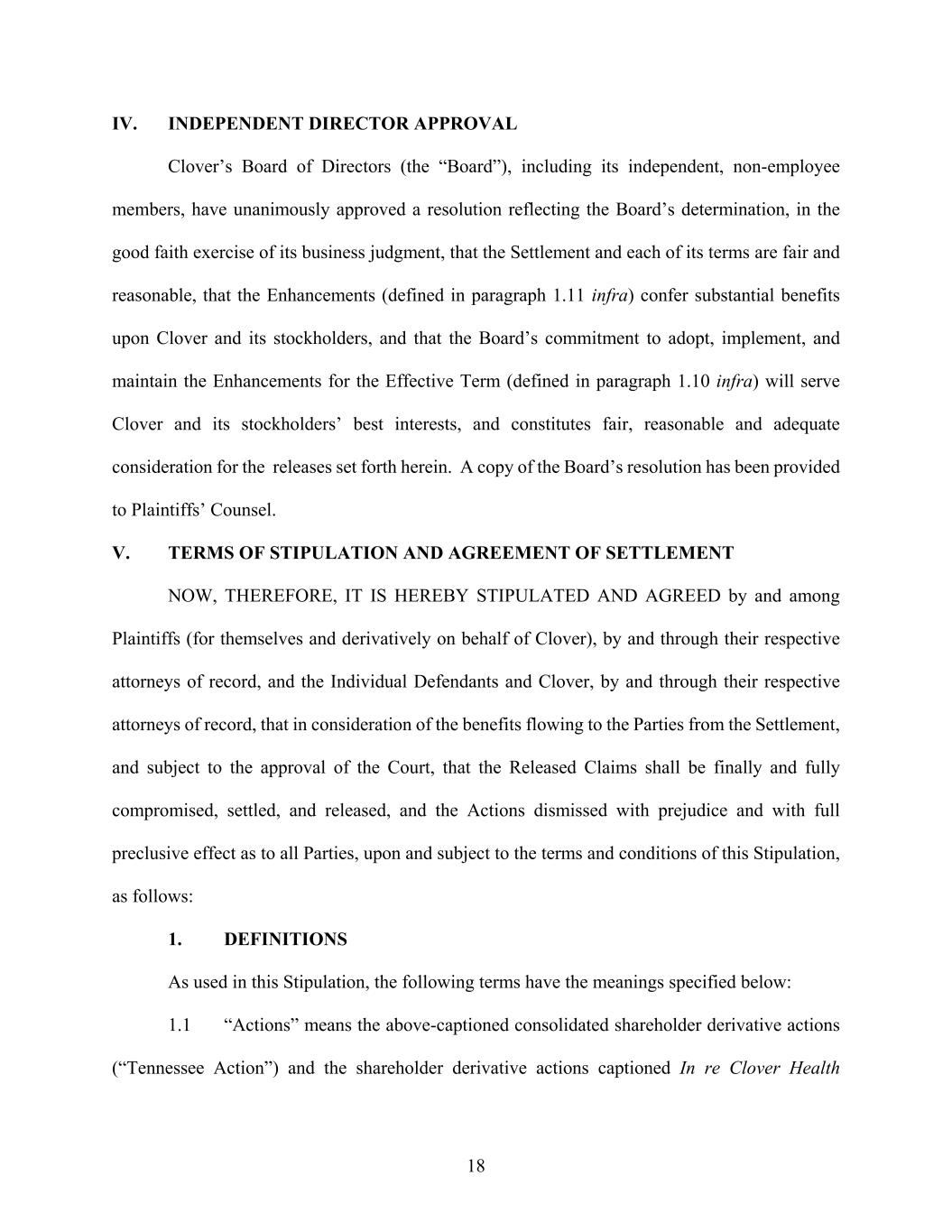 18 IV. INDEPENDENT DIRECTOR APPROVAL Clover’s Board of Directors (the “Board”), including its independent, non-employee members, have unanimously approved a resolution reflecting the Board’s determination, in the good faith exercise of its business judgment, that the Settlement and each of its terms are fair and reasonable, that the Enhancements (defined in paragraph 1.11 infra) confer substantial benefits upon Clover and its stockholders, and that the Board’s commitment to adopt, implement, and maintain the Enhancements for the Effective Term (defined in paragraph 1.10 infra) will serve Clover and its stockholders’ best interests, and constitutes fair, reasonable and adequate consideration for the releases set forth herein. A copy of the Board’s resolution has been provided to Plaintiffs’ Counsel. V. TERMS OF STIPULATION AND AGREEMENT OF SETTLEMENT NOW, THEREFORE, IT IS HEREBY STIPULATED AND AGREED by and among Plaintiffs (for themselves and derivatively on behalf of Clover), by and through their respective attorneys of record, and the Individual Defendants and Clover, by and through their respective attorneys of record, that in consideration of the benefits flowing to the Parties from the Settlement, and subject to the approval of the Court, that the Released Claims shall be finally and fully compromised, settled, and released, and the Actions dismissed with prejudice and with full preclusive effect as to all Parties, upon and subject to the terms and conditions of this Stipulation, as follows: 1. DEFINITIONS As used in this Stipulation, the following terms have the meanings specified below: 1.1 “Actions” means the above-captioned consolidated shareholder derivative actions (“Tennessee Action”) and the shareholder derivative actions captioned In re Clover Health