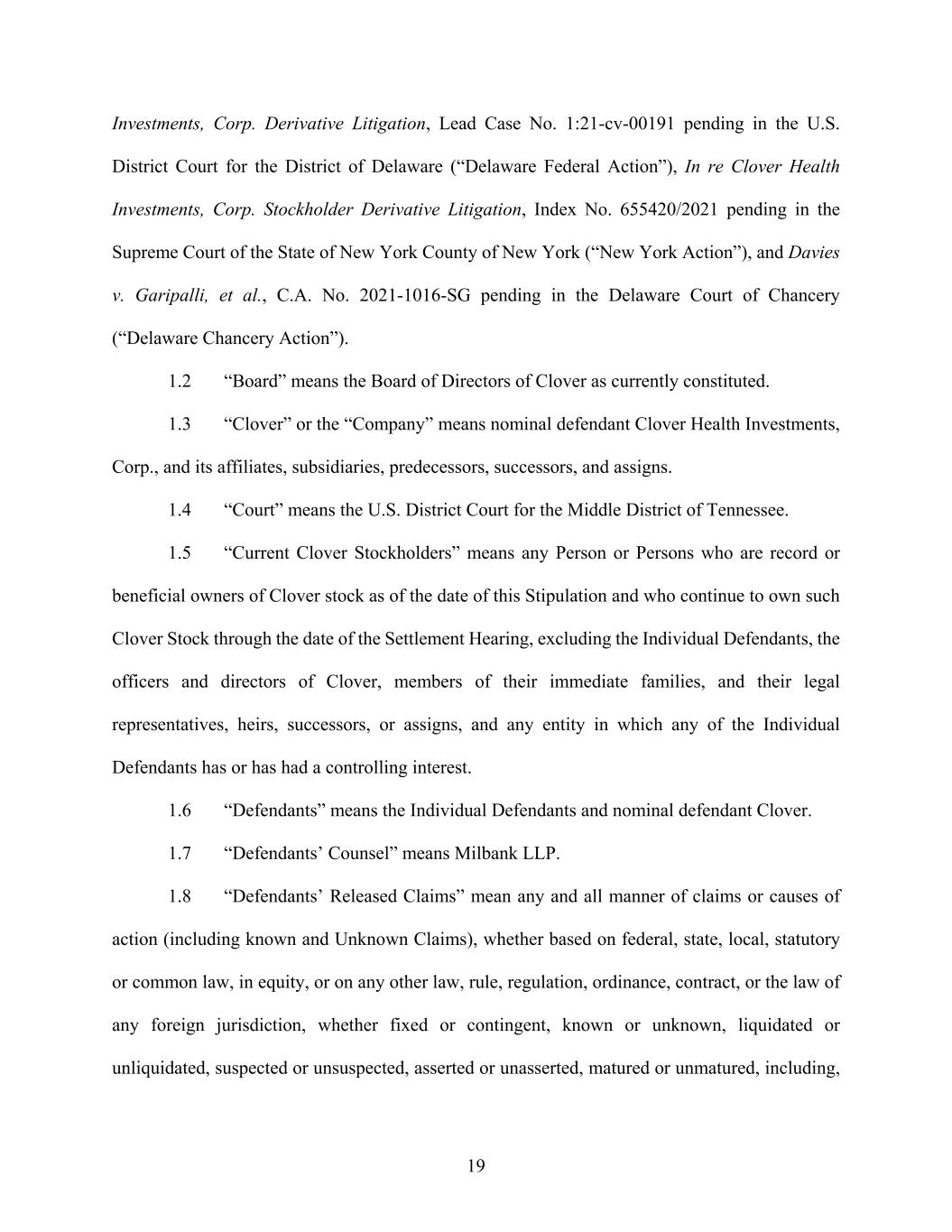 19 Investments, Corp. Derivative Litigation, Lead Case No. 1:21-cv-00191 pending in the U.S. District Court for the District of Delaware (“Delaware Federal Action”), In re Clover Health Investments, Corp. Stockholder Derivative Litigation, Index No. 655420/2021 pending in the Supreme Court of the State of New York County of New York (“New York Action”), and Davies v. Garipalli, et al., C.A. No. 2021-1016-SG pending in the Delaware Court of Chancery (“Delaware Chancery Action”). 1.2 “Board” means the Board of Directors of Clover as currently constituted. 1.3 “Clover” or the “Company” means nominal defendant Clover Health Investments, Corp., and its affiliates, subsidiaries, predecessors, successors, and assigns. 1.4 “Court” means the U.S. District Court for the Middle District of Tennessee. 1.5 “Current Clover Stockholders” means any Person or Persons who are record or beneficial owners of Clover stock as of the date of this Stipulation and who continue to own such Clover Stock through the date of the Settlement Hearing, excluding the Individual Defendants, the officers and directors of Clover, members of their immediate families, and their legal representatives, heirs, successors, or assigns, and any entity in which any of the Individual Defendants has or has had a controlling interest. 1.6 “Defendants” means the Individual Defendants and nominal defendant Clover. 1.7 “Defendants’ Counsel” means Milbank LLP. 1.8 “Defendants’ Released Claims” mean any and all manner of claims or causes of action (including known and Unknown Claims), whether based on federal, state, local, statutory or common law, in equity, or on any other law, rule, regulation, ordinance, contract, or the law of any foreign jurisdiction, whether fixed or contingent, known or unknown, liquidated or unliquidated, suspected or unsuspected, asserted or unasserted, matured or unmatured, including,