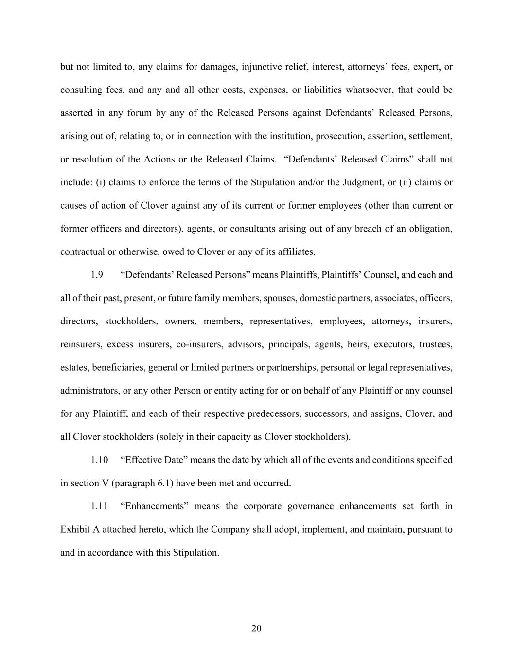 20 but not limited to, any claims for damages, injunctive relief, interest, attorneys’ fees, expert, or consulting fees, and any and all other costs, expenses, or liabilities whatsoever, that could be asserted in any forum by any of the Released Persons against Defendants’ Released Persons, arising out of, relating to, or in connection with the institution, prosecution, assertion, settlement, or resolution of the Actions or the Released Claims. “Defendants’ Released Claims” shall not include: (i) claims to enforce the terms of the Stipulation and/or the Judgment, or (ii) claims or causes of action of Clover against any of its current or former employees (other than current or former officers and directors), agents, or consultants arising out of any breach of an obligation, contractual or otherwise, owed to Clover or any of its affiliates. 1.9 “Defendants’ Released Persons” means Plaintiffs, Plaintiffs’ Counsel, and each and all of their past, present, or future family members, spouses, domestic partners, associates, officers, directors, stockholders, owners, members, representatives, employees, attorneys, insurers, reinsurers, excess insurers, co-insurers, advisors, principals, agents, heirs, executors, trustees, estates, beneficiaries, general or limited partners or partnerships, personal or legal representatives, administrators, or any other Person or entity acting for or on behalf of any Plaintiff or any counsel for any Plaintiff, and each of their respective predecessors, successors, and assigns, Clover, and all Clover stockholders (solely in their capacity as Clover stockholders). 1.10 “Effective Date” means the date by which all of the events and conditions specified in section V (paragraph 6.1) have been met and occurred. 1.11 “Enhancements” means the corporate governance enhancements set forth in Exhibit A attached hereto, which the Company shall adopt, implement, and maintain, pursuant to and in accordance with this Stipulation.