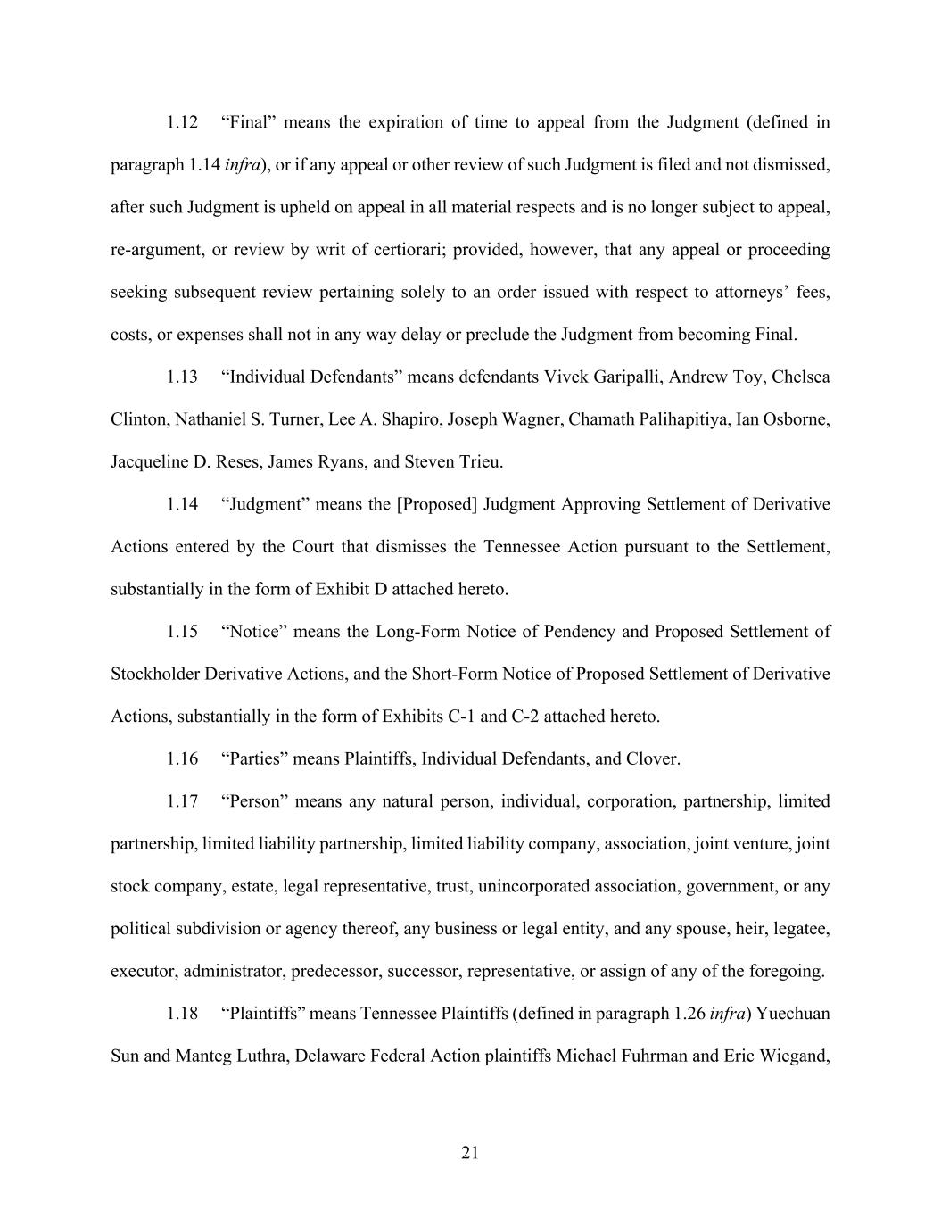 21 1.12 “Final” means the expiration of time to appeal from the Judgment (defined in paragraph 1.14 infra), or if any appeal or other review of such Judgment is filed and not dismissed, after such Judgment is upheld on appeal in all material respects and is no longer subject to appeal, re-argument, or review by writ of certiorari; provided, however, that any appeal or proceeding seeking subsequent review pertaining solely to an order issued with respect to attorneys’ fees, costs, or expenses shall not in any way delay or preclude the Judgment from becoming Final. 1.13 “Individual Defendants” means defendants Vivek Garipalli, Andrew Toy, Chelsea Clinton, Nathaniel S. Turner, Lee A. Shapiro, Joseph Wagner, Chamath Palihapitiya, Ian Osborne, Jacqueline D. Reses, James Ryans, and Steven Trieu. 1.14 “Judgment” means the [Proposed] Judgment Approving Settlement of Derivative Actions entered by the Court that dismisses the Tennessee Action pursuant to the Settlement, substantially in the form of Exhibit D attached hereto. 1.15 “Notice” means the Long-Form Notice of Pendency and Proposed Settlement of Stockholder Derivative Actions, and the Short-Form Notice of Proposed Settlement of Derivative Actions, substantially in the form of Exhibits C-1 and C-2 attached hereto. 1.16 “Parties” means Plaintiffs, Individual Defendants, and Clover. 1.17 “Person” means any natural person, individual, corporation, partnership, limited partnership, limited liability partnership, limited liability company, association, joint venture, joint stock company, estate, legal representative, trust, unincorporated association, government, or any political subdivision or agency thereof, any business or legal entity, and any spouse, heir, legatee, executor, administrator, predecessor, successor, representative, or assign of any of the foregoing. 1.18 “Plaintiffs” means Tennessee Plaintiffs (defined in paragraph 1.26 infra) Yuechuan Sun and Manteg Luthra, Delaware Federal Action plaintiffs Michael Fuhrman and Eric Wiegand,