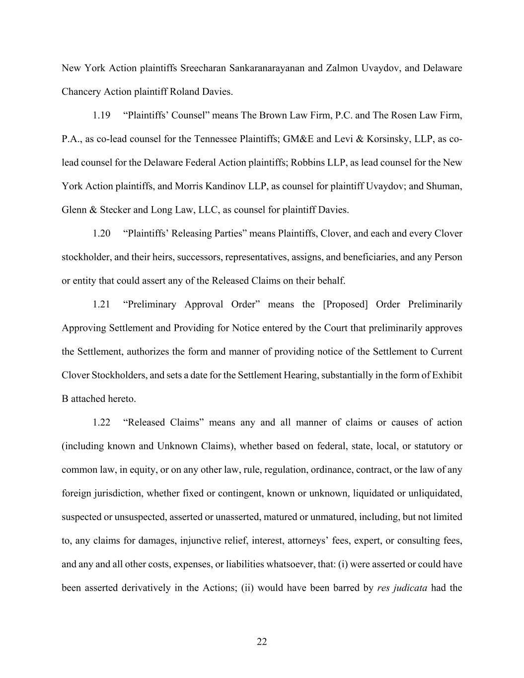 22 New York Action plaintiffs Sreecharan Sankaranarayanan and Zalmon Uvaydov, and Delaware Chancery Action plaintiff Roland Davies. 1.19 “Plaintiffs’ Counsel” means The Brown Law Firm, P.C. and The Rosen Law Firm, P.A., as co-lead counsel for the Tennessee Plaintiffs; GM&E and Levi & Korsinsky, LLP, as co- lead counsel for the Delaware Federal Action plaintiffs; Robbins LLP, as lead counsel for the New York Action plaintiffs, and Morris Kandinov LLP, as counsel for plaintiff Uvaydov; and Shuman, Glenn & Stecker and Long Law, LLC, as counsel for plaintiff Davies. 1.20 “Plaintiffs’ Releasing Parties” means Plaintiffs, Clover, and each and every Clover stockholder, and their heirs, successors, representatives, assigns, and beneficiaries, and any Person or entity that could assert any of the Released Claims on their behalf. 1.21 “Preliminary Approval Order” means the [Proposed] Order Preliminarily Approving Settlement and Providing for Notice entered by the Court that preliminarily approves the Settlement, authorizes the form and manner of providing notice of the Settlement to Current Clover Stockholders, and sets a date for the Settlement Hearing, substantially in the form of Exhibit B attached hereto. 1.22 “Released Claims” means any and all manner of claims or causes of action (including known and Unknown Claims), whether based on federal, state, local, or statutory or common law, in equity, or on any other law, rule, regulation, ordinance, contract, or the law of any foreign jurisdiction, whether fixed or contingent, known or unknown, liquidated or unliquidated, suspected or unsuspected, asserted or unasserted, matured or unmatured, including, but not limited to, any claims for damages, injunctive relief, interest, attorneys’ fees, expert, or consulting fees, and any and all other costs, expenses, or liabilities whatsoever, that: (i) were asserted or could have been asserted derivatively in the Actions; (ii) would have been barred by res judicata had the