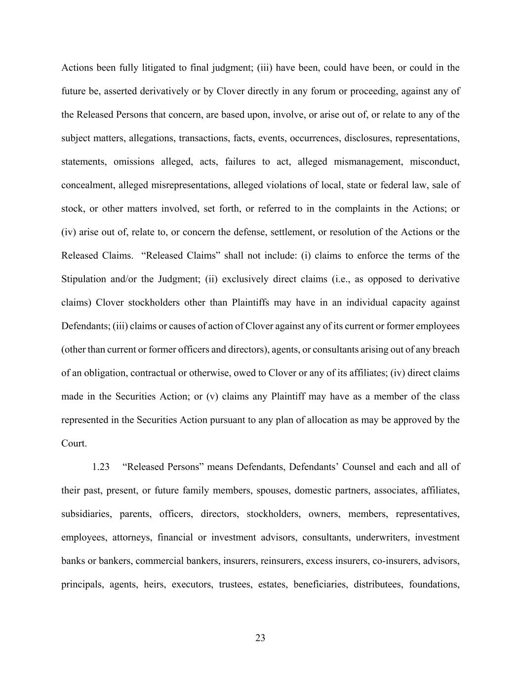 23 Actions been fully litigated to final judgment; (iii) have been, could have been, or could in the future be, asserted derivatively or by Clover directly in any forum or proceeding, against any of the Released Persons that concern, are based upon, involve, or arise out of, or relate to any of the subject matters, allegations, transactions, facts, events, occurrences, disclosures, representations, statements, omissions alleged, acts, failures to act, alleged mismanagement, misconduct, concealment, alleged misrepresentations, alleged violations of local, state or federal law, sale of stock, or other matters involved, set forth, or referred to in the complaints in the Actions; or (iv) arise out of, relate to, or concern the defense, settlement, or resolution of the Actions or the Released Claims. “Released Claims” shall not include: (i) claims to enforce the terms of the Stipulation and/or the Judgment; (ii) exclusively direct claims (i.e., as opposed to derivative claims) Clover stockholders other than Plaintiffs may have in an individual capacity against Defendants; (iii) claims or causes of action of Clover against any of its current or former employees (other than current or former officers and directors), agents, or consultants arising out of any breach of an obligation, contractual or otherwise, owed to Clover or any of its affiliates; (iv) direct claims made in the Securities Action; or (v) claims any Plaintiff may have as a member of the class represented in the Securities Action pursuant to any plan of allocation as may be approved by the Court. 1.23 “Released Persons” means Defendants, Defendants’ Counsel and each and all of their past, present, or future family members, spouses, domestic partners, associates, affiliates, subsidiaries, parents, officers, directors, stockholders, owners, members, representatives, employees, attorneys, financial or investment advisors, consultants, underwriters, investment banks or bankers, commercial bankers, insurers, reinsurers, excess insurers, co-insurers, advisors, principals, agents, heirs, executors, trustees, estates, beneficiaries, distributees, foundations,