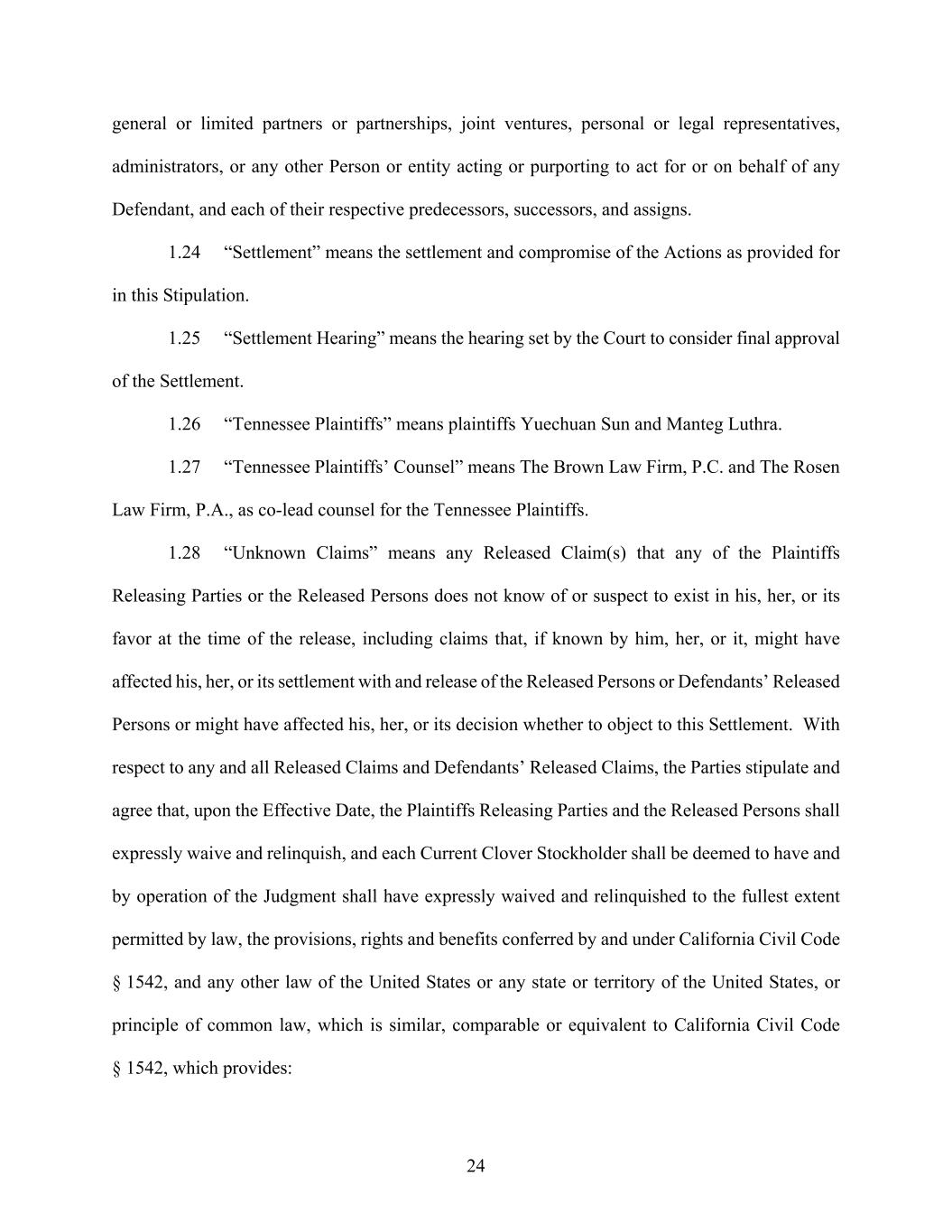 24 general or limited partners or partnerships, joint ventures, personal or legal representatives, administrators, or any other Person or entity acting or purporting to act for or on behalf of any Defendant, and each of their respective predecessors, successors, and assigns. 1.24 “Settlement” means the settlement and compromise of the Actions as provided for in this Stipulation. 1.25 “Settlement Hearing” means the hearing set by the Court to consider final approval of the Settlement. 1.26 “Tennessee Plaintiffs” means plaintiffs Yuechuan Sun and Manteg Luthra. 1.27 “Tennessee Plaintiffs’ Counsel” means The Brown Law Firm, P.C. and The Rosen Law Firm, P.A., as co-lead counsel for the Tennessee Plaintiffs. 1.28 “Unknown Claims” means any Released Claim(s) that any of the Plaintiffs Releasing Parties or the Released Persons does not know of or suspect to exist in his, her, or its favor at the time of the release, including claims that, if known by him, her, or it, might have affected his, her, or its settlement with and release of the Released Persons or Defendants’ Released Persons or might have affected his, her, or its decision whether to object to this Settlement. With respect to any and all Released Claims and Defendants’ Released Claims, the Parties stipulate and agree that, upon the Effective Date, the Plaintiffs Releasing Parties and the Released Persons shall expressly waive and relinquish, and each Current Clover Stockholder shall be deemed to have and by operation of the Judgment shall have expressly waived and relinquished to the fullest extent permitted by law, the provisions, rights and benefits conferred by and under California Civil Code § 1542, and any other law of the United States or any state or territory of the United States, or principle of common law, which is similar, comparable or equivalent to California Civil Code § 1542, which provides: